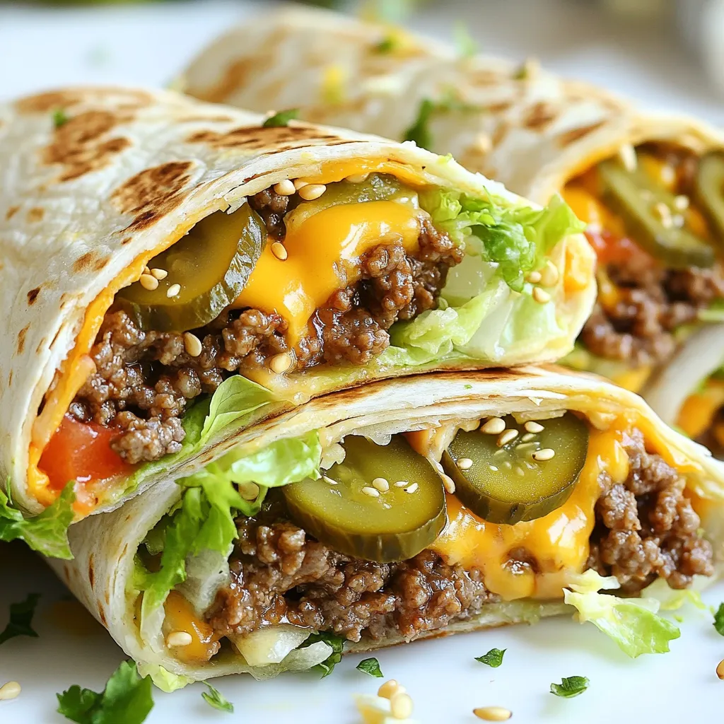 - 1 lb ground beef - 4 large flour tortillas - 1 cup shredded lettuce - 1 cup diced tomatoes - 1 cup cheddar cheese, shredded - 1/2 cup pickles, sliced These main ingredients create the heart of your Big Mac Wrap. The ground beef gives it that classic flavor. Using large flour tortillas acts as the perfect wrap. Fresh lettuce and tomatoes add crunch and color. The cheese brings it all together, while pickles add a zesty kick. - 1 tablespoon onion powder - 1 tablespoon garlic powder - 1 tablespoon salt - 1 tablespoon pepper Seasonings make your Big Mac Wrap pop with flavor. Onion and garlic powders enhance the beef. Salt and pepper balance everything, making each bite tasty. Proper seasoning is key for a great meal. - 1/2 cup Thousand Island dressing - Optional: pepper jack cheese - Optional: 1 tablespoon sesame seeds (for garnish) Thousand Island dressing ties the wrap together. It gives a creamy and tangy taste. If you want a spicy twist, add pepper jack cheese. Sprinkling sesame seeds on top adds a fun touch and extra crunch. Enjoy your Big Mac Wraps with these special components for a delightful meal! {{ingredient_image_1}} First, I heat a large skillet over medium heat. Once hot, I add 1 pound of ground beef. I break it apart with a spatula. I cook it until the beef is brown, about 5 to 7 minutes. This step is key to getting great flavor. After browning, I drain any excess fat from the skillet. Next, I add 1 tablespoon of onion powder, 1 tablespoon of garlic powder, 1 tablespoon of salt, and 1 tablespoon of pepper. I stir it well and let it cook for 2 more minutes. This adds depth to the meat and makes it taste just like a Big Mac. Now, it's time to assemble the wraps. I lay out a large flour tortilla on a clean surface. I spread a generous tablespoon of Thousand Island dressing right in the center. This sauce gives the wrap its classic taste. On top of the dressing, I add about 1/4 cup of the beef mixture. Then, I layer on 1 cup of shredded lettuce, 1 cup of diced tomatoes, 1 cup of shredded cheddar cheese, and 1/2 cup of sliced pickles. Each layer adds its own burst of flavor, making the wrap fun to eat! To fold the wrap, I first tuck in the sides of the tortilla. Then, I roll it up tightly from the bottom. This keeps all the delicious filling inside. I repeat this process for the remaining tortillas and filling. For a nice touch, I sprinkle sesame seeds on top of the wraps. This step is optional but adds a nice crunch. Finally, I serve the wraps right away or wrap them in foil for later. Cutting the wraps in half and serving with extra dressing makes for a great presentation! To make the best Big Mac wraps, ensure your beef is cooked right. Brown the ground beef in a skillet over medium heat. This takes about 5 to 7 minutes. Break it up with a spatula as it cooks. Once browned, drain any fat. Add onion powder, garlic powder, salt, and pepper. Stir for 2 minutes. This makes the beef tasty. After cooking, cool the mixture before assembly. Let it sit for a few minutes. This step helps keep your wraps from becoming soggy. Cutting the wraps makes them fun to eat. Slice them in half diagonally. This not only looks nice but also makes it easy to dip. Serve with extra Thousand Island dressing for dipping. Place the wraps on a colorful plate. Add some fresh greens around them for extra color. To keep wraps fresh, store them in foil. This helps prevent them from drying out. You can also place them in an airtight container. If you have leftovers, eat them within two days. For reheating, use a microwave or an oven. If using a microwave, heat for about 30 seconds. For the oven, preheat to 350°F and heat for about 10 minutes. This keeps the wrap warm and tasty. Pro Tips Use Lean Ground Beef: Opt for lean ground beef (at least 85% lean) to reduce excess grease and create a healthier wrap. Customize Your Veggies: Feel free to add or substitute veggies like diced onions, jalapeños, or bell peppers for extra flavor and crunch. Warm the Tortillas: Slightly warm the tortillas in a dry skillet before assembling; this makes them more pliable and easier to roll without tearing. Chill Before Serving: For a refreshing twist, chill the assembled wraps in the fridge for 15-30 minutes before serving to enhance the flavors. {{image_2}} You can make Big Mac Wraps meat-free. Start by substituting ground beef with plant-based meat. This swap gives you a similar taste and texture. You can use veggie crumbles or lentils for a healthy twist. Next, add extra veggies. Try bell peppers, carrots, or cucumbers. These will add crunch and color to your wrap, making it even more fun. For a low-carb version, use lettuce wraps instead of flour tortillas. This keeps the wrap fresh and light. Romaine or iceberg lettuce works best. You can also try alternative sauces. Instead of Thousand Island, use a creamy ranch or a zesty salsa. These options can give the wrap a new flavor while keeping it healthy. To spice things up, add spices for heat. A pinch of cayenne or chili powder can make your wrap exciting. If you love cheese, explore different cheese options. Swap cheddar for pepper jack or mozzarella for a new taste. These small changes can elevate your Big Mac Wraps to a whole new level. A Big Mac Wrap is fun and tasty, but it also packs some calories. Each serving has about 450 calories. Here’s how the macronutrients break down: - Protein: 25 grams - Carbohydrates: 35 grams - Fat: 25 grams This wrap gives you a good amount of protein, thanks to the beef and cheese. You’ll also get some carbs from the tortillas, which provide energy. When you compare a Big Mac Wrap to a traditional Big Mac, there are some key differences. A Big Mac has more calories and saturated fat. The wrap uses less beef and skips the extra bun, making it lighter. If you want to make it healthier, consider these tips: - Use lean ground turkey or chicken instead of beef. - Choose whole wheat tortillas for more fiber. - Add more veggies like spinach or 