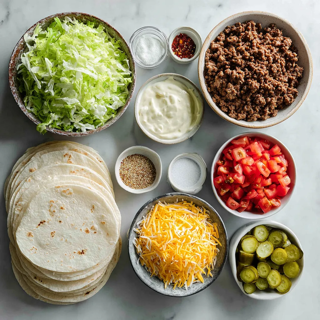 These main ingredients create the heart of your Big Mac Wrap. The ground beef gives it that classic flavor. Using large flour tortillas acts as the perfect wrap. Fresh lettuce and tomatoes add crunch and color. The cheese brings it all together, while pickles add a zesty kick.
