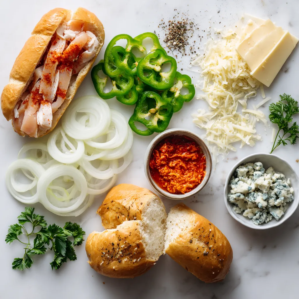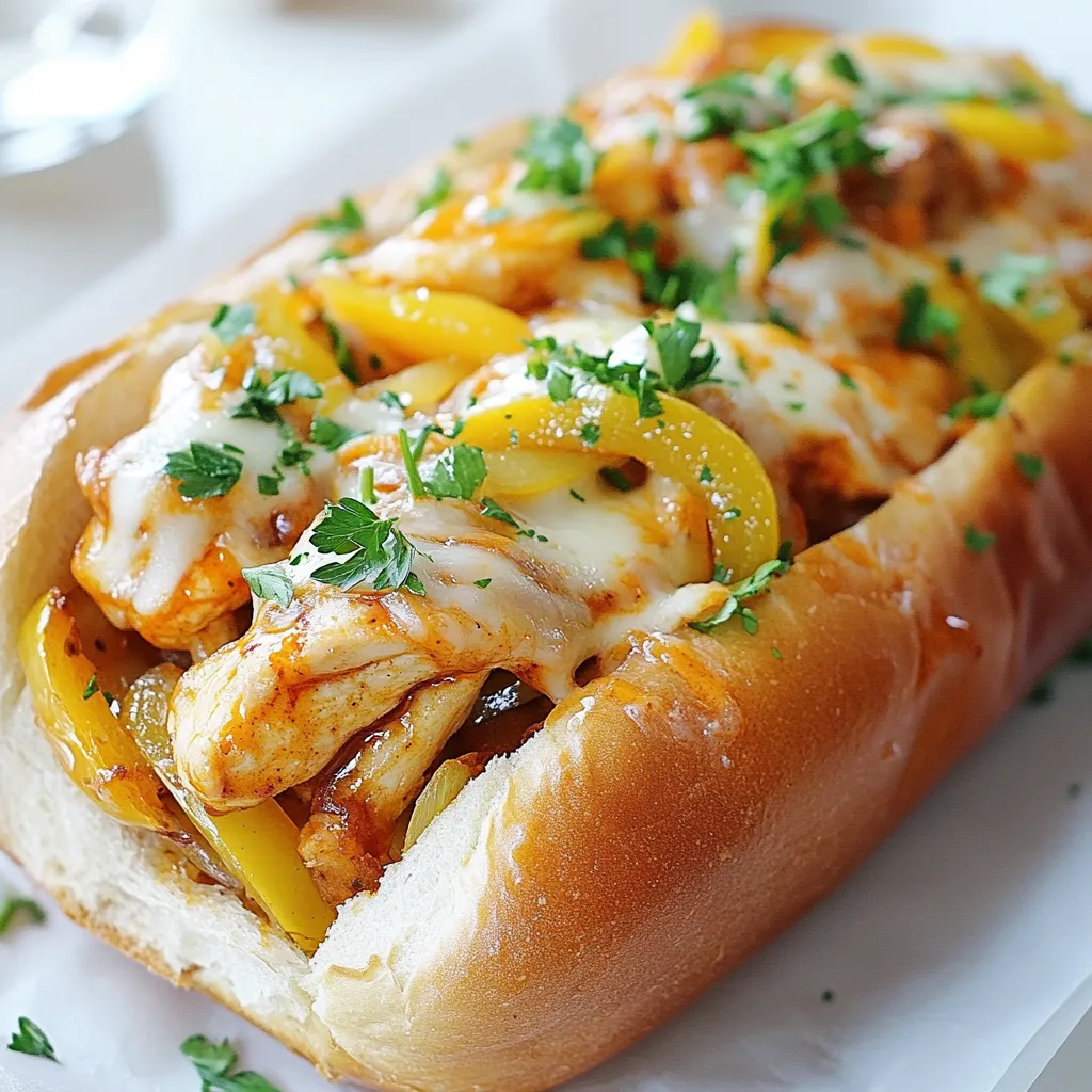 - 2 boneless, skinless chicken breasts - 1 tablespoon olive oil - 1 cup crushed buffalo sauce - 1 medium onion, sliced - 1 bell pepper (green or red), sliced - 4 slices provolone cheese - 4 hoagie rolls - Salt and pepper to taste - 1/4 cup blue cheese crumbles - Fresh parsley, chopped When it comes to buffalo sauce, I have a few favorites. Frank's RedHot is a classic choice. It offers a great balance of heat and flavor. Another good option is the Anchor Bar sauce, which adds a rich taste. If you want something less spicy, try Sweet Baby Ray's buffalo sauce. It brings sweetness with a mild kick. Choose what fits your taste best for a fun, flavorful meal. {{ingredient_image_1}} Start by slicing the chicken breasts into thin strips. This helps them cook fast and evenly. Season the strips with salt and pepper. This will add flavor. Next, heat a large skillet over medium heat and add one tablespoon of olive oil. Once the oil is hot, add the chicken strips. Cook them for about 5 to 7 minutes. You want them to be no longer pink inside. After that, pour in one cup of crushed buffalo sauce. Stir well to coat the chicken evenly. Let it cook for an extra 2 to 3 minutes. This gives the chicken time to soak up the spicy flavor. Now, it’s time to add some veggies. Push the cooked chicken to one side of the skillet. Add sliced onion and bell pepper to the empty space. Sauté these for about 4 to 5 minutes until they are tender. Once the vegetables are ready, mix them with the chicken. This creates a tasty filling. The sweet peppers and onions balance the spicy sauce well. Preheat your oven to 350°F (175°C). While it heats, slice the hoagie rolls lengthwise. Don’t cut all the way through; leave a pocket for the filling. Take a baking sheet and place the rolls on it. Spoon the buffalo chicken and veggie mix into each roll. Make sure to fill them well. Lastly, add a slice of provolone cheese on top of each filled roll. Bake them in the oven for about 5 to 7 minutes. You want the cheese to melt and bubble. If you like, sprinkle some blue cheese crumbles on top. Garnish with fresh parsley for a pop of color. Enjoy your savory buffalo chicken cheesesteaks! To make juicy chicken, start with fresh ingredients. Slice the chicken breasts thinly. This helps them cook fast and stay tender. Season lightly with salt and pepper. Heat olive oil in a skillet over medium heat. Add the chicken and cook for about 5-7 minutes. The chicken should turn white and firm. Pour in the buffalo sauce and stir well. Let it cook for a few more minutes. This helps the chicken soak up the flavors. For the best cheese melt, use provolone cheese. It melts nicely and adds great taste. When you assemble the cheesesteaks, place the cheese on top of the hot chicken. This helps it melt faster. Bake the cheesesteaks in a preheated oven at 350°F. Keep an eye on them for about 5-7 minutes. You want the cheese to be bubbly and slightly brown. This adds a lovely texture and flavor. To boost the flavor, don’t skip seasoning. Use salt and pepper on the chicken. Add more spice by mixing in garlic powder or onion powder. For a tangy kick, consider adding a dash of lemon juice. When you sauté the onions and peppers, they add sweetness. This balances the heat from the buffalo sauce. If you like blue cheese, sprinkle some on top. It adds creaminess and depth to each bite. Pro Tips Cook Chicken Thoroughly: Ensure the chicken is cooked to an internal temperature of 165°F (75°C) for safe consumption. Customize Heat Level: Adjust the amount of buffalo sauce based on your spice preference—add more for extra heat or less for a milder flavor. Vegetable Variations: Feel free to add other vegetables, such as mushrooms or spinach, to enhance the flavor and nutrition of your cheesesteak. Toasting Rolls: For an extra crispy texture, toast the hoagie rolls in the oven for a few minutes before filling them with the chicken mixture. {{image_2}} If you want to go meatless, try these tasty options. Use mushrooms or jackfruit as your main filling. Both options soak up flavor well. You can also add roasted cauliflower for great texture. Just sauté your veggies in olive oil until tender. Toss them in buffalo sauce for that spicy kick. This way, you can enjoy the cheesesteak without chicken. Cheese makes a cheesesteak special. Provolone is a classic choice, but you can mix it up. Try mozzarella for a milder flavor. Pepper jack adds nice heat, or go for cheddar for sharpness. If you want a creamy touch, use cream cheese or goat cheese. All these options melt beautifully and add rich taste. Buffalo sauce is a must, but don’t stop there. You can explore other sauces too. Barbecue sauce adds a sweet twist. Ranch dressing gives it a creamy, herb flavor. You can also sprinkle in spices like garlic powder or smoked paprika for more depth. Experiment with these flavors to make your cheesesteak unique and fun. After you enjoy your Buffalo Chicken Cheesesteak, you might have some left. To store leftovers, let them cool down first. Place the cheesesteaks in an airtight container. They can stay fresh in the fridge for about 3 to 4 days. If you want to keep them longer, freezing is a good option. When you're ready to eat leftovers, you can reheat them easily. Preheat your oven to 350°F (175°C). Wrap the cheesesteaks in foil to keep them moist. Heat for about 10-15 minutes until they are warm. You can also use a microwave, but the oven makes the cheese melt better. If you plan to freeze your Buffalo Chicken Cheesesteak, do it right after cooking. Wrap each cheesesteak in plastic wrap, then put them in a freezer bag. They can last for up to 3 months in the freezer. When you're ready to eat, thaw them in the fridge overnight. Then, reheat as mentioned above. This way, you have a quick meal ready anytime! You can enjoy Buffalo Chicken Cheesesteak with many sides. Some great options include: - Crispy French fries - Fresh coleslaw - Mixed green salad - Potato wedges - Sweet 