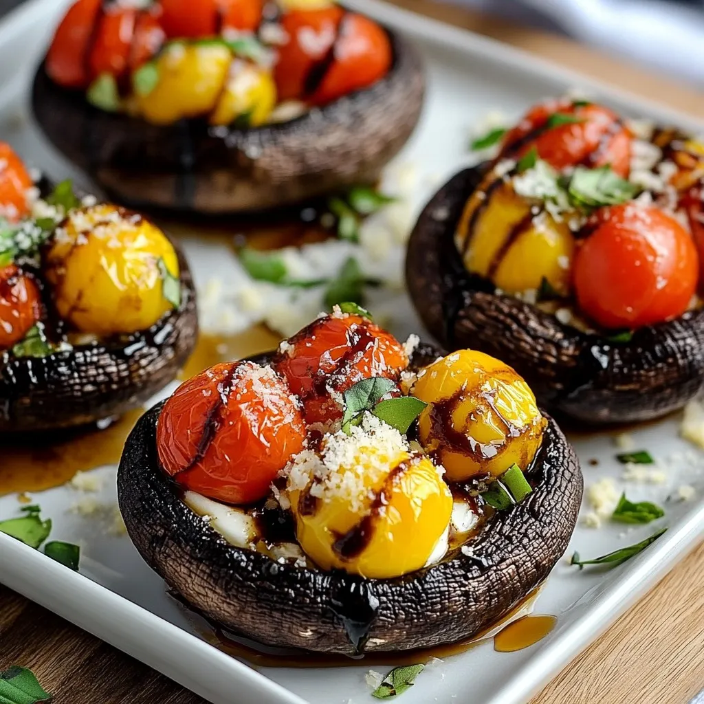 Delicious portobello mushrooms filled with cherry tomatoes, mozzarella, and fresh basil, drizzled with balsamic glaze.