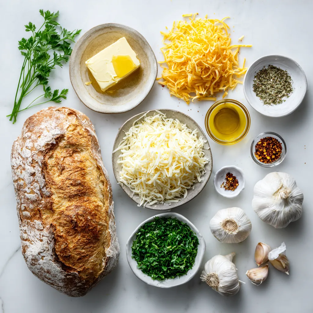 The main ingredients for cheesy pull-apart garlic bread are quite simple. You need a big loaf of sourdough or Italian bread. The bread holds all the cheese and flavors well. Next, mozzarella and sharp cheddar cheese give that gooey, tasty bite.