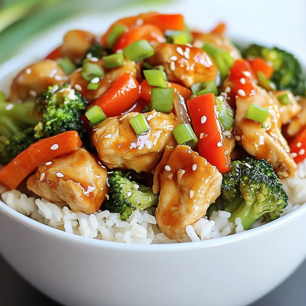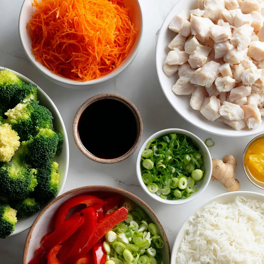 These ingredients create a tasty and colorful chicken bowl. The chicken adds protein, while the veggies bring vitamins. The soy sauce and sesame oil give the dish a rich flavor.