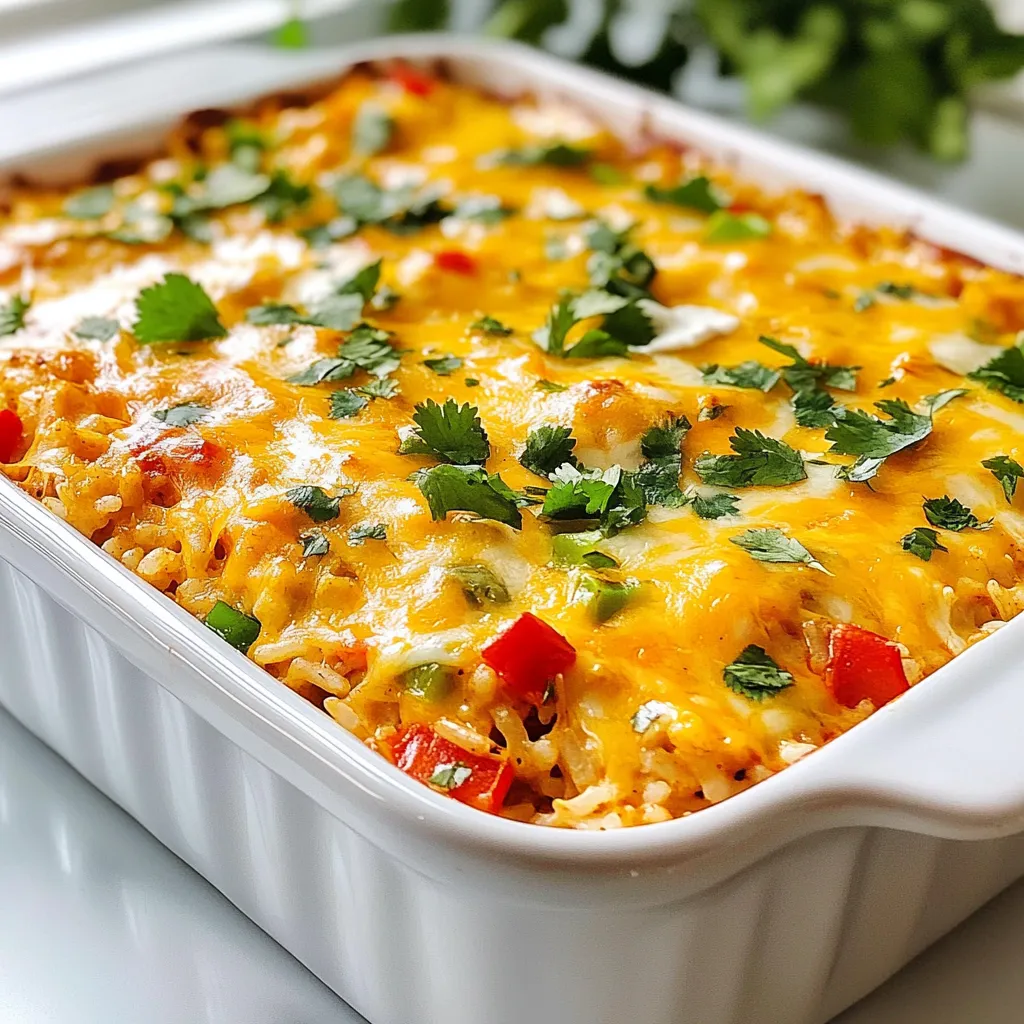 A delicious and hearty casserole combining rice, chicken, and enchilada flavors.