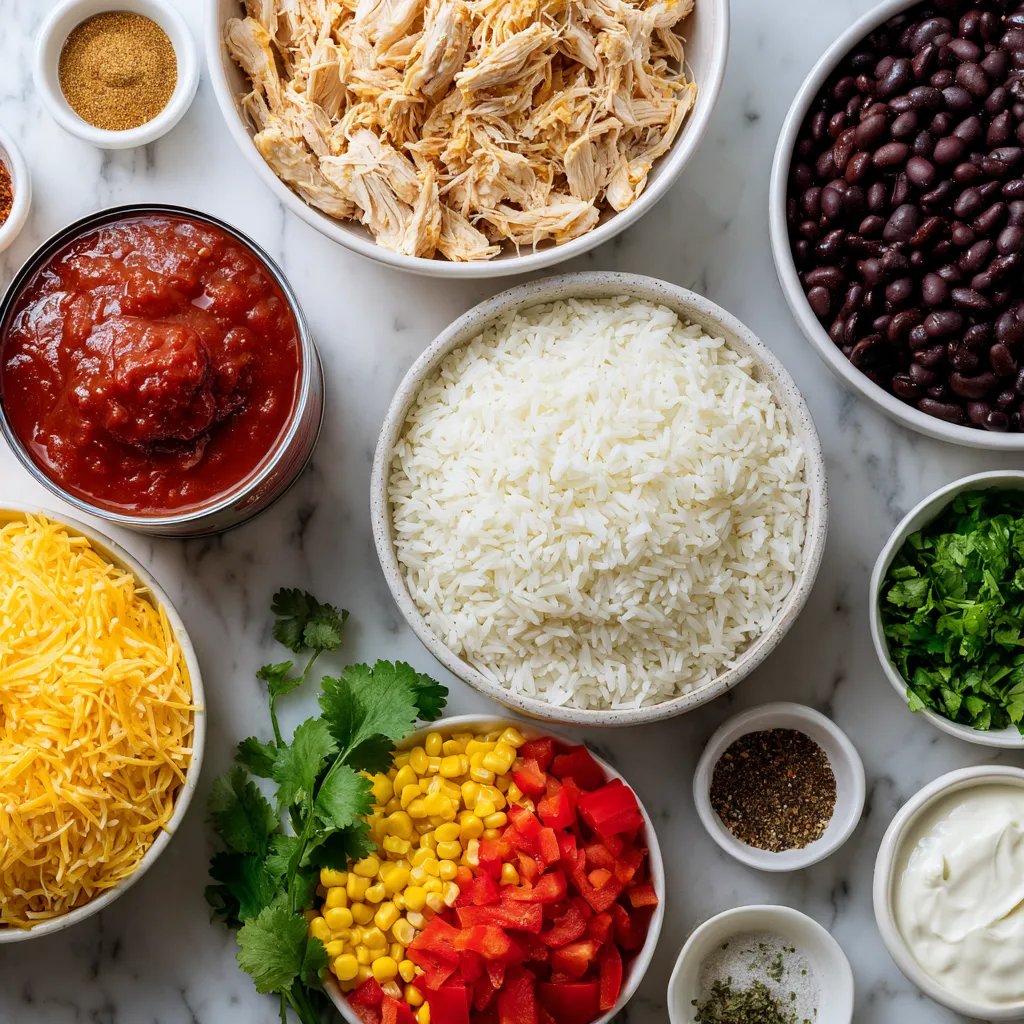 The main ingredients create a hearty base for the casserole. I love using cooked rice as it absorbs all the flavors. Shredded chicken adds protein and a nice texture. Black beans are great for fiber and taste. Corn brings sweetness, while colorful bell peppers add crunch and vitamins. The mix of cheddar and Monterey Jack cheese gives a rich, creamy finish.