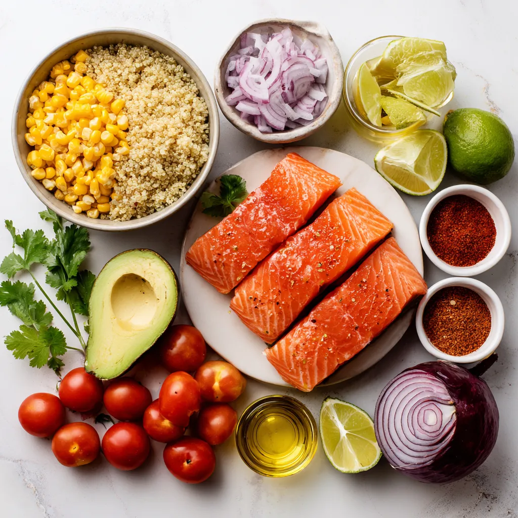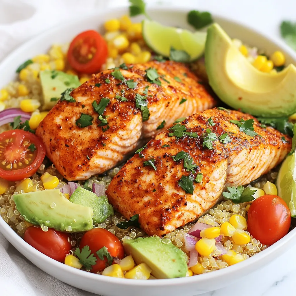 Each ingredient brings unique flavors and nutrients. Salmon is rich in omega-3 fatty acids, which are great for heart health. Quinoa serves as a protein-packed base. The lime juice adds a bright zing that balances the spices. Fresh vegetables boost the nutrition and add color to your bowl. This meal is not only tasty but also good for you!