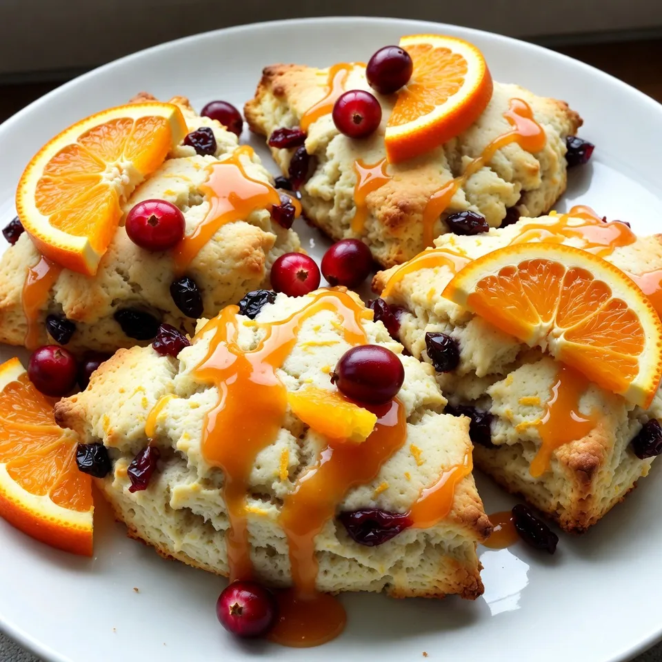 Arrange the scones on a beautiful plate and garnish them with a few fresh cranberries and orange slices for a festive touch!