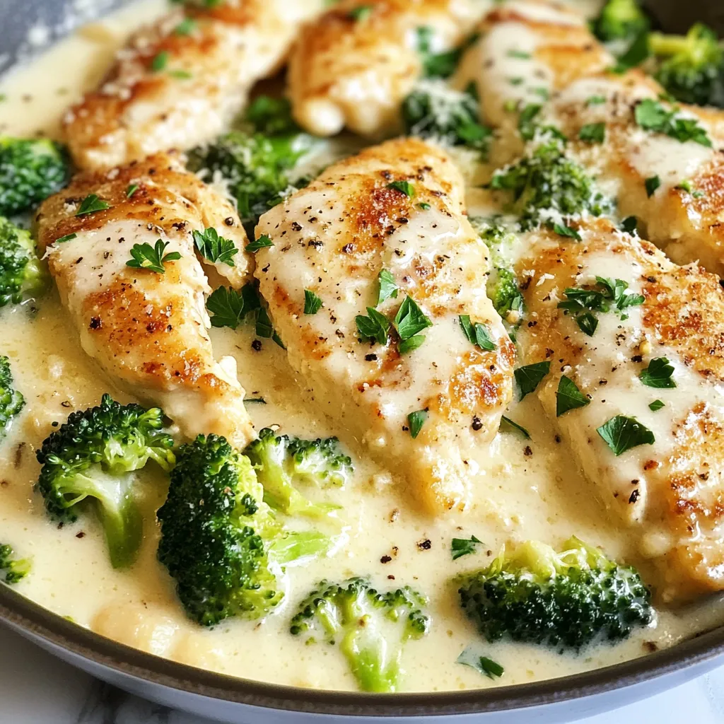 Now, it’s time for the broccoli. Add the florets to the skillet and cover with a lid. Let them steam in the creamy sauce for 4 to 5 minutes. This keeps them bright and tender. Return the chicken to the skillet and sprinkle with Parmesan cheese. Stir everything to combine and cook for another 2 minutes. Adjust the seasonings to taste. Garnish with chopped fresh parsley. Serve hot and enjoy this delightful meal!