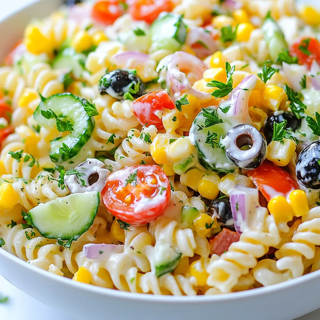 - 250g rotini pasta - 1 cup cherry tomatoes, halved - 1 cup cucumber, diced - 1/2 cup red bell pepper, diced - 1/4 cup red onion, finely chopped - 1 cup sweet corn (canned or cooked) - 1/2 cup black olives, sliced - 1 cup creamy Greek yogurt - 1/4 cup mayonnaise - 1 tablespoon Dijon mustard - 2 tablespoons lemon juice - Salt and black pepper to taste - 1 teaspoon dried oregano - Fresh parsley, chopped (for garnish) These ingredients create a wonderful mix of colors and flavors. The rotini pasta holds the creamy dressing well, making each bite a delight. Fresh vegetables like cherry tomatoes and cucumber add crunch and brightness. Using Greek yogurt and mayonnaise makes the dressing rich and creamy without being too heavy. Lemon juice adds a zesty kick. Oregano gives it warmth and depth. You can also add black olives and sweet corn for extra taste. Fresh parsley is not just a garnish; it adds a lovely touch of color and freshness. When you pick your ingredients, choose fresh ones. Fresh veggies make the salad taste better. If you want to switch things up, you can add other ingredients, but these are the core ones. {{ingredient_image_1}} 1. Start by boiling a large pot of salted water. Add enough salt to make the water taste like the sea. 2. Once the water boils, add 250 grams of rotini pasta. Cook it until al dente, which usually takes about 8 to 10 minutes. Stir it occasionally to prevent sticking. 3. After cooking, drain the pasta in a colander. Rinse it under cold water. This stops the pasta from cooking further and helps it cool down. 1. While the pasta cools, wash your vegetables. Dicing makes them easy to mix and eat. 2. Halve 1 cup of cherry tomatoes. Dice 1 cup of cucumber and 1/2 cup of red bell pepper. 3. Finely chop 1/4 cup of red onion. You can adjust the amount based on your taste. 4. Combine all these vegetables in a large mixing bowl. 1. In a separate bowl, whisk together the dressing ingredients. Use 1 cup of creamy Greek yogurt, 1/4 cup of mayonnaise, and 1 tablespoon of Dijon mustard. 2. Add 2 tablespoons of lemon juice, 1 teaspoon of dried oregano, and salt and black pepper to taste. 3. Taste the dressing and adjust the flavors. Add more salt, pepper, or lemon juice if needed. 1. Now, pour the creamy dressing over the pasta and vegetables in the mixing bowl. 2. Toss everything gently to coat the pasta and veggies evenly. Make sure every bite gets that creamy goodness. 1. After mixing, cover the salad with plastic wrap or a lid. Chill it in the fridge for at least 30 minutes. This helps all the flavors blend together. 2. When ready to serve, garnish the salad with freshly chopped parsley for a pop of color. Enjoy your refreshing creamy pasta salad! To get a creamy texture, always choose high-quality yogurt and mayonnaise. These add richness and flavor. You can also try using sour cream or cream cheese for a different twist. Both can make your pasta salad even creamier. To boost flavor, start with salt and pepper. You can also add garlic powder or onion powder. Using fresh herbs like parsley or basil can brighten your dish. They add color and taste. Just chop them finely for a nice touch. Creamy pasta salad goes great with grilled chicken or fish. It also pairs well with crusty bread. For serving size, about one cup is perfect for each person. This dish is great for picnics or potlucks. It stays fresh and tasty, making it a crowd-pleaser! Pro Tips Perfect Pasta: To achieve the best texture, make sure to cook the rotini pasta until it's al dente. This will help it maintain its shape and prevent it from becoming mushy when mixed with the dressing. Chill for Flavor: Allowing the pasta salad to chill in the refrigerator for at least 30 minutes helps the flavors meld together, resulting in a more delicious dish. Fresh Ingredients: Using fresh, high-quality vegetables such as ripe cherry tomatoes and crisp cucumbers can significantly enhance the overall taste and texture of your pasta salad. Customize Your Salad: Feel free to add other ingredients like diced avocado, feta cheese, or even cooked chicken to make this pasta salad your own! {{image_2}} You can use many types of pasta for this salad. Rotini works great, but penne and fusilli are also fun. They add a nice twist to your dish. If you need a gluten-free option, look for rice or chickpea pasta. These choices keep the dish tasty while meeting dietary needs. Adding protein can turn this salad into a meal. Grilled chicken or shrimp adds flavor and makes it filling. For a plant-based choice, try tofu or chickpeas. They boost protein without meat. Both options fit well with the creamy dressing. Fresh veggies can change with the seasons. In summer, add fresh corn or zucchini for a crisp bite. In winter, roasted squash or Brussels sprouts work nicely. Seasonal veggies keep your salad exciting and full of flavor. This way, you can enjoy a new taste each time you make it. Store your creamy pasta salad in an airtight container. This helps keep it fresh. If you don’t have one, use a bowl covered with plastic wrap. Make sure no air can get in. Place it in the fridge right after serving. This keeps it safe and tasty. Your creamy pasta salad lasts for about three to five days in the fridge. Look for signs that it has gone bad. If you see mold or an off smell, throw it away. If the pasta feels slimy, it’s time to say goodbye. Freezing creamy pasta salad is not recommended. The texture of the pasta and veggies may change when thawed. If you must freeze it, use a freezer-safe container. Thaw it in the fridge overnight before serving. Stir well to mix the ingredients again. Yes, you can use low-fat yogurt. It will make the salad lighter. Greek yogurt gives a rich taste, while low-fat yogurt is a healthier option. Both will still create a creamy texture. If you want to cut calories, low-fat yogurt works well. Try adding red pepper flakes or diced jalapeños. These will kick up the heat. You can also mix in hot sauce or a splash of srir