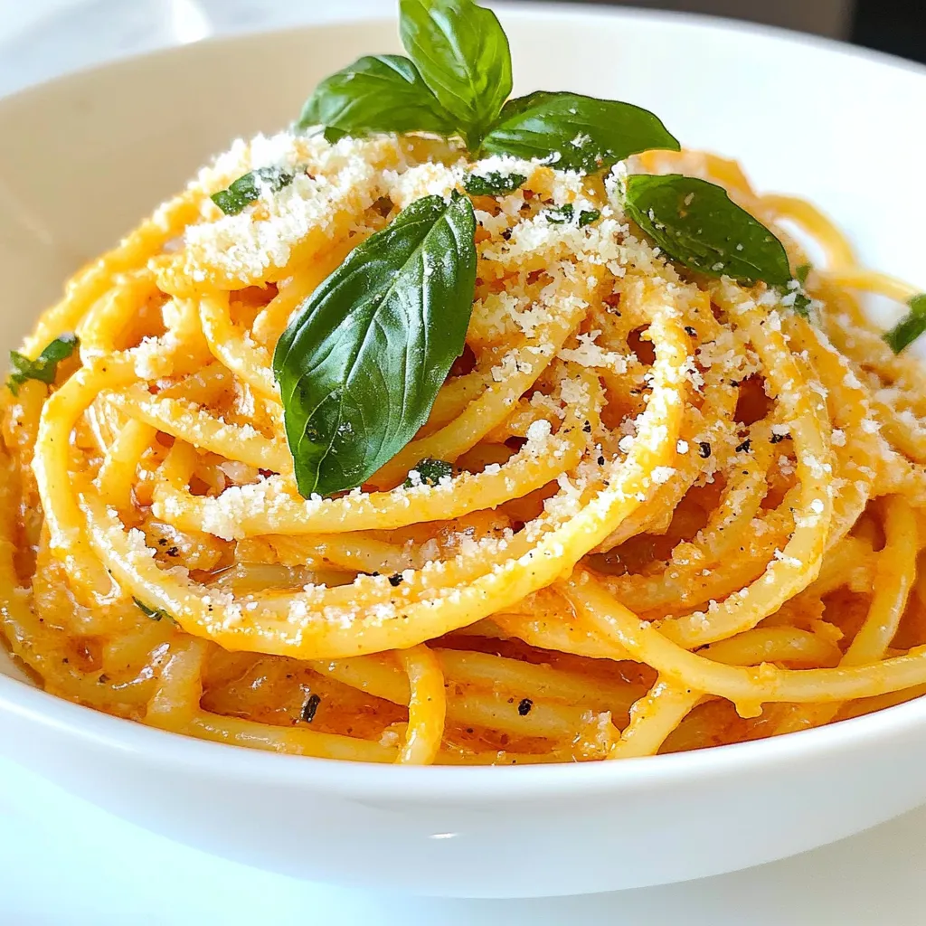 - 300g pasta (spaghetti or penne) - 1 tablespoon olive oil - 1 medium onion, finely chopped - 2 cloves garlic, minced - 1 can (400g) crushed tomatoes - 1 cup heavy cream or coconut cream for a dairy-free version - 1 teaspoon dried oregano - 1 teaspoon sugar - Salt and pepper to taste - Fresh basil leaves, for garnish - Grated Parmesan cheese (optional) You can swap heavy cream for coconut cream if you want a dairy-free dish. If you don’t have crushed tomatoes, use diced tomatoes instead. You can also replace the onion with shallots for a milder taste. If you want a gluten-free option, try a gluten-free pasta. For a vegan dish, leave out the Parmesan cheese or use a vegan alternative. Spaghetti and penne work best for creamy tomato pasta. Other great choices include fusilli and farfalle. These shapes hold the sauce well, making every bite tasty. You can also experiment with whole grain or chickpea pasta for added nutrition. {{ingredient_image_1}} Start by bringing a large pot of salted water to a boil. Add the pasta, either spaghetti or penne. Cook it according to the package instructions until it is al dente. This usually takes around 8 to 10 minutes. When done, reserve ½ cup of the pasta cooking water. Drain the pasta in a colander, but keep that water. You might need it later for the sauce. While your pasta cooks, grab a large skillet. Heat 1 tablespoon of olive oil over medium heat. Add 1 medium onion that you have finely chopped. Sauté this for 3 to 4 minutes until it turns translucent. Next, add 2 cloves of minced garlic. Cook this for an extra 1 to 2 minutes until you smell that fragrant garlic aroma. Pour in 1 can of crushed tomatoes, which is about 400 grams. Sprinkle in 1 teaspoon of dried oregano and 1 teaspoon of sugar. Season with salt and pepper to taste. Let this mixture simmer for about 10 minutes, stirring occasionally to blend the flavors. Now, lower the heat and gradually stir in 1 cup of heavy cream or coconut cream for a dairy-free option. Mix it well until the sauce becomes creamy. If the sauce is too thick, add that reserved pasta water a little at a time until it reaches your desired consistency. Once your sauce is creamy, it’s time to add the pasta. Toss the drained pasta into the skillet, ensuring it gets a nice coating of the sauce. Let it cook together for another 2 minutes. This helps the flavors meld perfectly. Taste your dish and adjust the seasoning if needed. Serve hot and garnish with fresh basil leaves and grated Parmesan cheese if you like. Enjoy the rich and creamy flavors of your homemade tomato pasta! To make your sauce creamy, use heavy cream or coconut cream. Both work well. If you find the sauce too thick, add some pasta water. This will help reach the right texture. Stir in the cream slowly for even mixing. Each bite should feel smooth and rich. Add fresh herbs like basil to boost flavors. You can also add grated Parmesan cheese for a cheesy kick. A pinch of red pepper flakes will give a nice heat. If you want a sweet touch, a little sugar balances the acidity of the tomatoes. Don’t skip salting the pasta water. This step adds flavor to the pasta. Avoid cooking the sauce too fast, as it needs time to blend flavors. Make sure to taste the sauce before serving. Adjust salt and pepper as needed for a perfect finish. Pro Tips Use Fresh Ingredients: Whenever possible, use fresh tomatoes instead of canned for a more vibrant flavor. If using canned, opt for high-quality brands. Adjust Creaminess: For a lighter sauce, you can substitute half of the heavy cream with vegetable or chicken broth, allowing the tomato flavor to shine. Enhance Flavor: Add a splash of balsamic vinegar or a pinch of red pepper flakes to the sauce for a depth of flavor and a little kick. Perfect Pasta Texture: Make sure not to overcook your pasta. Cooking it al dente ensures it holds up well in the sauce and absorbs flavors. {{image_2}} You can easily boost the flavor and nutrition of your creamy tomato pasta by adding proteins. Chicken is a great choice. Simply cook diced chicken in the skillet before adding the onion. For shrimp, add them after cooking the garlic. Cook them until they turn pink. You can also use cooked sausage for a hearty touch. Just slice it and mix it in with the sauce. If you want a vegetarian version, just skip the meat. You can add vegetables like spinach, mushrooms, or bell peppers. Sauté them along with the onions. For a vegan option, use coconut cream instead of heavy cream. This keeps the dish rich and creamy without dairy. You can also add nutritional yeast for a cheesy flavor. If you need a gluten-free option, choose gluten-free pasta. There are many types available, like rice or chickpea pasta. Just cook them as you would regular pasta. The creamy sauce works well with these options. Just be sure to check that your other ingredients, like the broth, are also gluten-free. To store your creamy tomato pasta, let it cool to room temperature first. Then, place it in an airtight container. This keeps it fresh and prevents unwanted smells in your fridge. Leftovers can stay good for up to three days. Always label the container with the date. This helps you track how long it has been stored. When you are ready to eat the leftovers, reheat them gently. You can use a skillet over medium heat. Add a splash of water or extra cream to keep it moist. Stir often to heat evenly. If you prefer the microwave, use a microwave-safe bowl. Heat in 30-second intervals, stirring in between, until it’s hot. If you want to freeze your creamy tomato pasta, use a freezer-safe container. Make sure to leave some space at the top. The sauce can expand when it freezes. Your pasta can last up to three months in the freezer. When you are ready to enjoy it, thaw it overnight in the fridge. Then, reheat it as mentioned above. This way, you can enjoy delicious pasta anytime! Yes, you can use fresh tomatoes. Start with about 1.5 pounds of fresh ripe tomatoes. Blanch and peel t