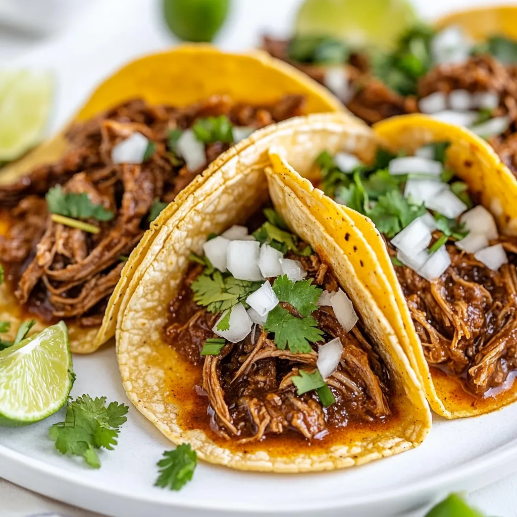 Delicious slow-cooked beef tacos with a rich, flavorful sauce.