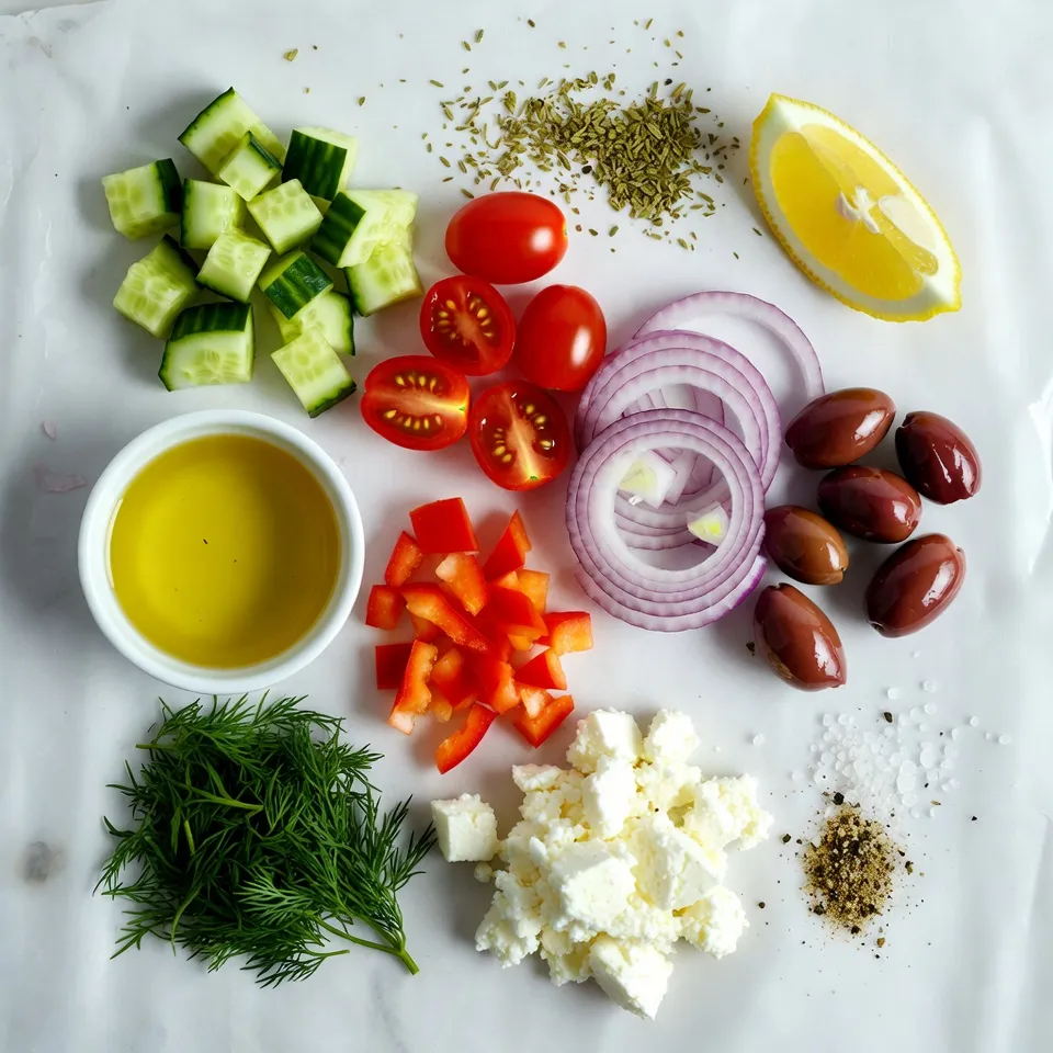 A refreshing salad featuring cucumbers, tomatoes, olives, and feta cheese, dressed with a dill and lemon vinaigrette.