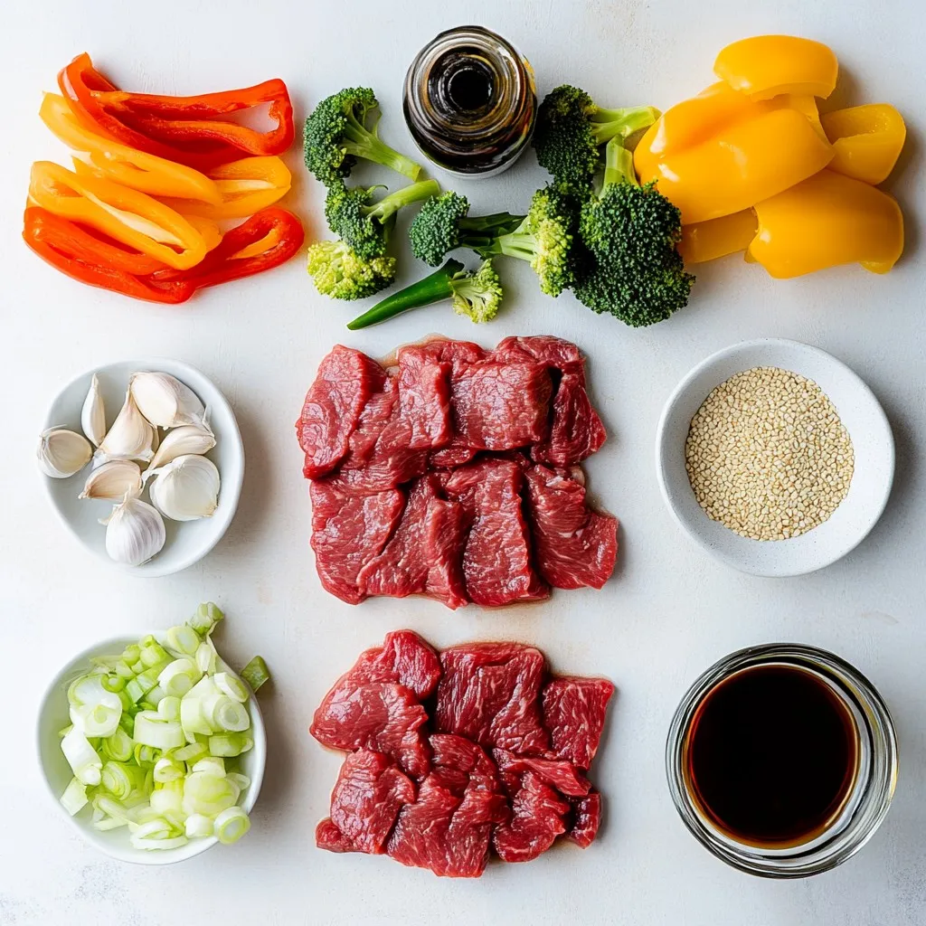 Gather these fresh ingredients before you start cooking. The beef sirloin gives the dish its rich flavor, while the colorful bell pepper and broccoli add crunch and nutrition. The teriyaki sauce is the star of the show. It combines soy sauce, honey, and vinegar for a tasty blend. Garlic and ginger add extra depth. The cornstarch slurry will help thicken the sauce, making it stick to the beef and veggies. Don’t forget the sesame seeds and green onions for the finishing touch. They make the dish look nice and add a little extra flavor.