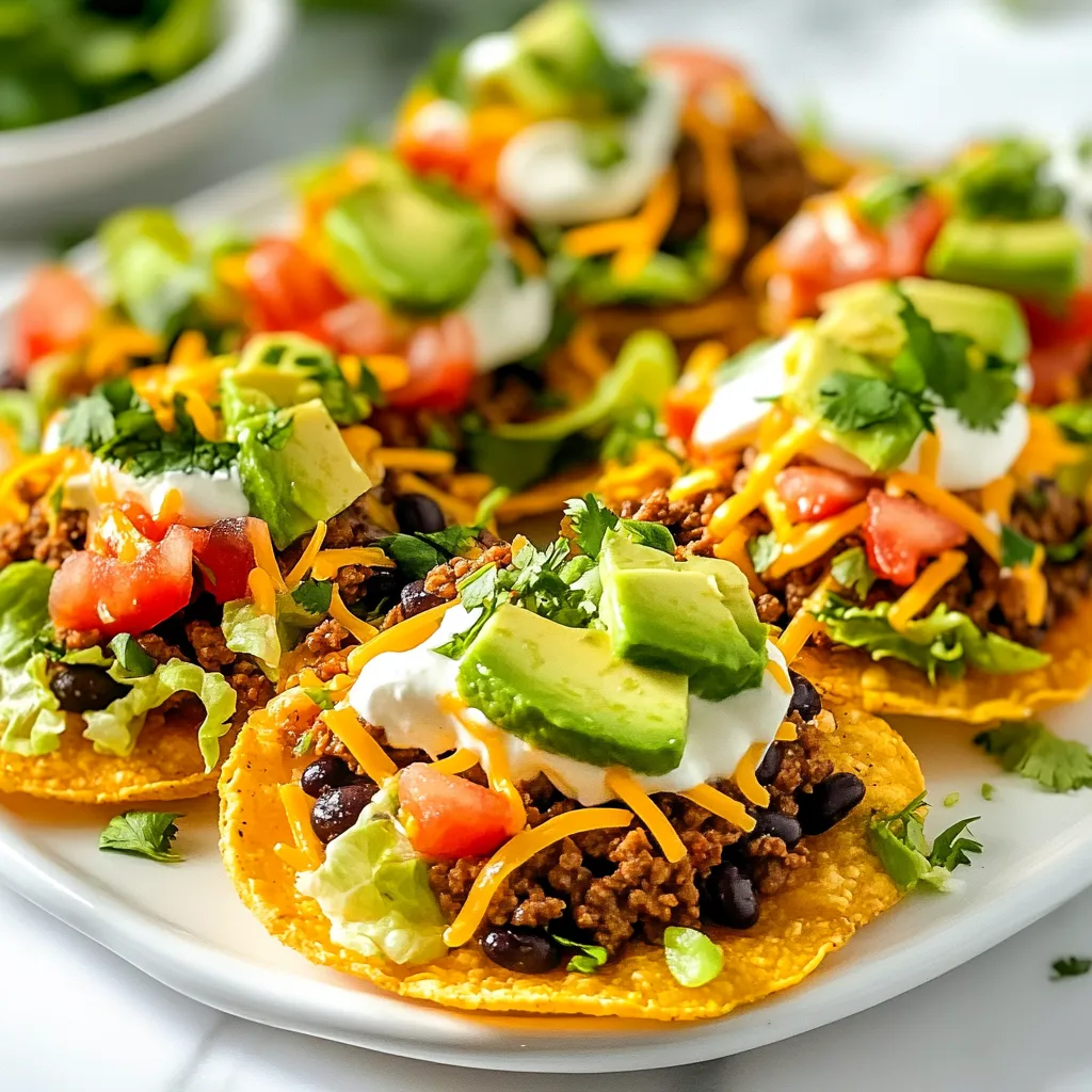 A delicious and vibrant dish featuring crunchy tostada shells topped with seasoned ground beef, black beans, fresh vegetables, and creamy avocado.