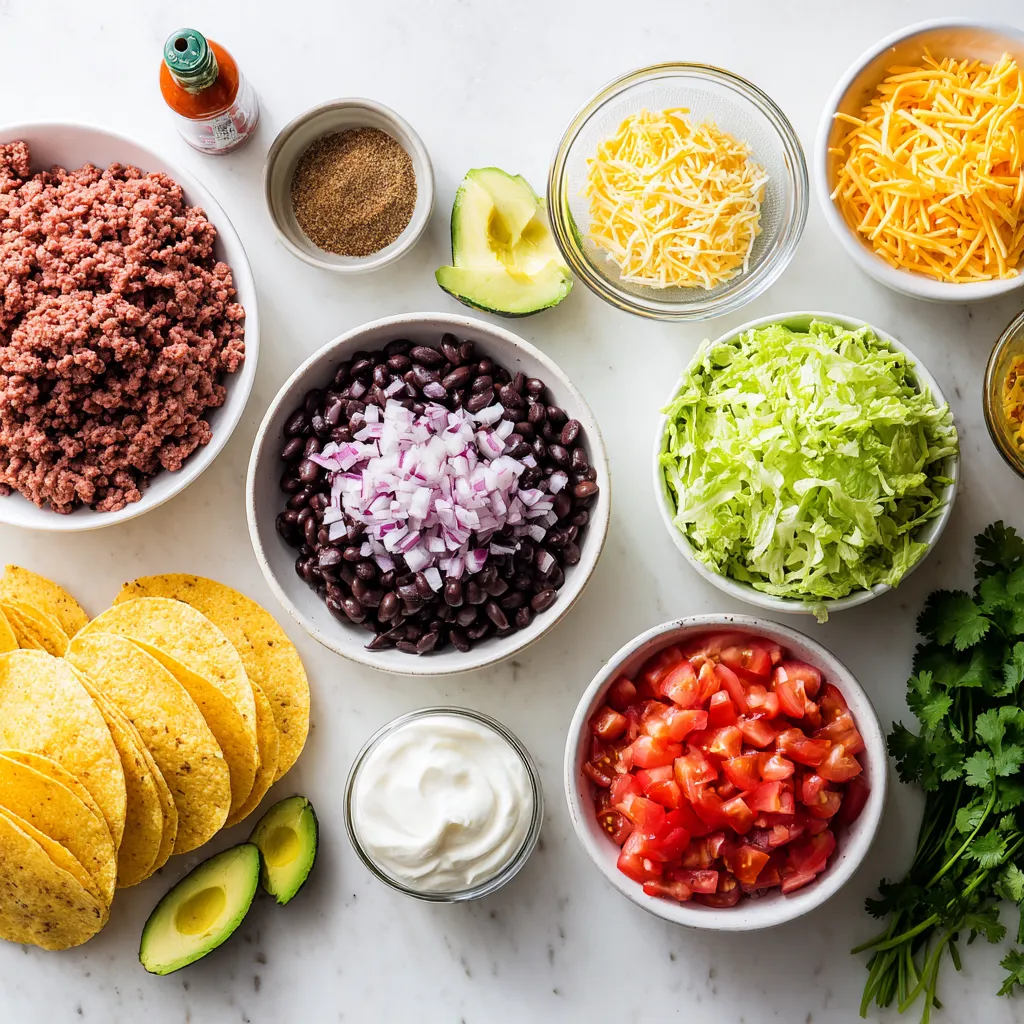 Gathering the right ingredients makes cooking fun and easy. I love using ground beef as my main protein. It’s juicy and packed with flavor. Chopping a small onion and mincing garlic adds great taste to the mix. The taco seasoning brings everything together with its warm spices.
