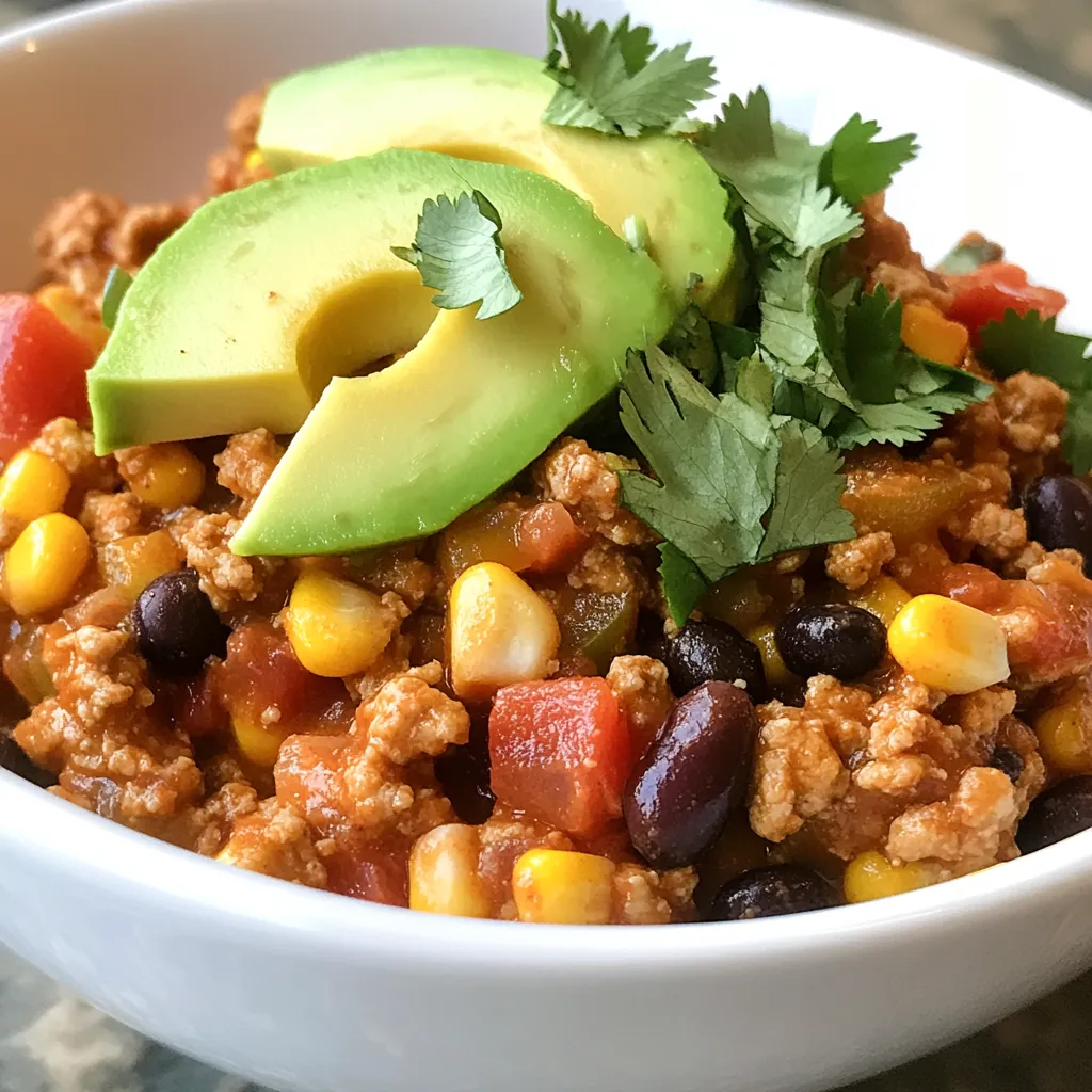 - 1 pound ground turkey - 1 cup cooked brown rice - 1 small onion, diced - 2 cloves garlic, minced - 1 bell pepper (red or green), diced - 1 cup black beans, drained and rinsed - 1 cup corn (fresh or frozen) - 1 can (14.5 oz) diced tomatoes with green chilies - 1 teaspoon cumin - 1 teaspoon smoked paprika - 1 teaspoon chili powder - Salt and pepper to taste - 2 tablespoons olive oil The main ingredients make this dish quick and tasty. Ground turkey gives you lean protein. I love using cooked brown rice for texture. Onions and bell peppers add sweetness and crunch. The garlic gives a nice aroma. Black beans and corn bring heartiness. Diced tomatoes with green chilies add flavor and a little heat. For the spices, cumin, smoked paprika, and chili powder create a warm taste. Salt and pepper help tie all the flavors together. Olive oil is key for sautéing the veggies and turkey. - Fresh cilantro, for garnish - Avocado slices, for serving Garnishes make meals look and taste better. Fresh cilantro adds a pop of color and fresh flavor. Avocado slices bring creaminess and balance to the dish. You can add these at the end for a beautiful and tasty finish. {{ingredient_image_1}} - First, heat 2 tablespoons of olive oil in a large skillet over medium heat. - Next, add 1 small diced onion and 1 diced bell pepper. Sauté them for 3-5 minutes until they start to soften. - After that, add 2 minced garlic cloves to the skillet. Cook for 1 more minute until you smell that lovely garlic aroma. - Now, raise the heat to medium-high. Add 1 pound of ground turkey to the skillet. - Use a spatula to break the turkey apart. Cook it for about 6-8 minutes, or until it's browned and cooked through. - Stir in 1 teaspoon of cumin, 1 teaspoon of smoked paprika, and 1 teaspoon of chili powder. Add salt and pepper to taste. Make sure the turkey is well coated in the spices. - Pour in 1 can of diced tomatoes with green chilies, 1 cup of black beans (drained and rinsed), and 1 cup of corn. - Also, mix in 1 cup of cooked brown rice. Stir everything until well combined and heated through, which should take about 5 minutes. - Taste your dish and adjust the seasoning if needed. This quick and flavorful meal is ready to serve! To ensure great flavor, mix spices well. I use cumin, smoked paprika, and chili powder. These add warmth and depth. Don’t skip the salt and pepper; they bring everything together. Taste your dish as you cook. Adjust seasoning if needed. This step makes a big difference. For cooking time, ground turkey needs just 6-8 minutes. Ensure it is browned and cooked through. Use a spatula to break it apart as it cooks. Proper browning helps develop rich flavors. If you overcook it, the turkey can dry out, so keep an eye on it. For sides, I love serving this dish with a green salad. The fresh crunch balances the warm skillet. You can also try tortilla chips for added crunch. A side of guacamole pairs well too. For toppings, fresh cilantro adds a nice touch. Avocado slices make it creamy. You can also add a dollop of sour cream or Greek yogurt. These toppings add flavor and texture. Enjoy mixing and matching! Pro Tips Use Lean Turkey: Opt for lean ground turkey to reduce fat content while maintaining flavor. Customize the Spice Level: Adjust the amount of chili powder and diced tomatoes with green chilies to suit your heat preference. Add More Veggies: Enhance nutrition by adding additional vegetables like zucchini or spinach to the skillet. Meal Prep Friendly: This dish can be made in advance and stored in the fridge for up to 3 days, making it perfect for meal prep! {{image_2}} You can swap out the ground turkey with other meats. Ground chicken or beef works well. If you want a lighter option, try ground turkey. Each meat brings a unique flavor. You can also use plant-based meat for a vegetarian dish. For veggies, you can change what you use. Try zucchini, carrots, or spinach instead of bell peppers. You can also add mushrooms for a hearty touch. Mixing different veggies makes the dish colorful and fun. Adjusting the heat level is easy. If you like spice, add more chili powder or jalapeños. For milder flavors, skip the chili powder. You can also reduce the diced tomatoes with green chilies. Experiment with different cuisine themes. Try adding curry powder for an Indian twist. Or, add soy sauce and ginger for an Asian flair. Each change brings new tastes to the skillet. Enjoy exploring flavors! You can store your Ground Turkey Dinner Skillet in the fridge. Use an airtight container. It stays fresh for up to three days. Before storing, let the dish cool. This helps it stay tasty and safe. When you are ready to eat, just reheat it on the stove or in the microwave. To freeze, place the cooled skillet meal in a freezer-safe container. You can also use freezer bags. Remove as much air as possible to prevent freezer burn. Label the container with the date. It will keep well for up to three months. To reheat, thaw the skillet in the fridge overnight. Heat it in a skillet over medium heat. Stir it often until hot. You can also use the microwave, but stir halfway through. Enjoy your quick and flavorful meal anytime! You can serve this dish with many sides. Here are some great options: - Salad: A fresh green salad adds crunch. - Tortillas: Warm corn or flour tortillas are perfect for wraps. - Sliced Avocado: Creamy avocado makes it richer. - Sour Cream: A dollop of sour cream adds creaminess. - Cheese: Shredded cheese brings extra flavor. These sides can enhance your meal and make it more filling. Yes, you can prepare this dish ahead of time. Cook the turkey and mix in other ingredients. Then let it cool before storing. Keep it in an airtight container in the fridge. It stays fresh for about three days. Reheat it on the stove or microwave before serving. This makes busy nights easier. Yes, this recipe is gluten-free. Ground turkey, beans, and rice do not contain gluten. Just be sure to check labels on canned items. Some d