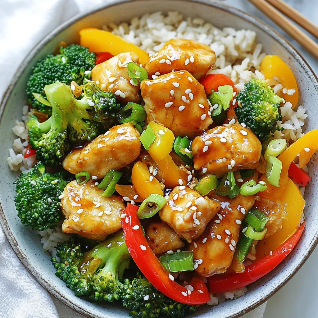- 1 lb boneless, skinless chicken breast, cut into bite-sized pieces - 2 tablespoons sesame oil - 3 tablespoons low-sodium soy sauce - 2 tablespoons honey or maple syrup - 3 cloves garlic, minced - 1 tablespoon ginger, grated - 1 cup broccoli florets - 1 bell pepper, sliced (any color) - 1 carrot, julienned - 2 green onions, sliced - 2 tablespoons sesame seeds - Cooked brown rice or quinoa (for serving) These ingredients come together to create a tasty and healthy dish. Chicken breast gives you lean protein. The sesame oil adds a rich flavor and healthy fats. Low-sodium soy sauce keeps the salt down while still boosting taste. Honey or maple syrup gives a hint of sweetness. Garlic and ginger both add bold flavors and health benefits. Broccoli, bell pepper, and carrot ensure you get your veggies in. Finally, sesame seeds and green onions give a nice crunch and fresh taste. You can swap some ingredients for a lighter twist: - Use skinless turkey breast instead of chicken for fewer calories. - Replace sesame oil with olive oil for a different flavor profile. - Try coconut aminos in place of soy sauce for a soy-free option. - Use agave syrup instead of honey for a plant-based sweetener. - Add spinach or snap peas for more greens and color. These swaps can keep the dish healthy while offering new tastes. - Chicken breast: High in protein, low in fat. Great for muscle health. - Sesame oil: Contains healthy fats and antioxidants. Good for heart health. - Low-sodium soy sauce: Offers flavor with less sodium, helping manage blood pressure. - Honey or maple syrup: Natural sugars that provide energy. - Garlic: Known for boosting the immune system and lowering cholesterol. - Ginger: Aids digestion and has anti-inflammatory properties. - Broccoli: Packed with vitamins C and K, plus fiber for digestion. - Bell pepper: Rich in vitamin A and antioxidants, good for skin health. - Carrot: High in beta-carotene, which is great for vision. - Green onions: Low in calories and provide vitamin K and folate. - Sesame seeds: Full of calcium and healthy fats, great for bone health. - Brown rice or quinoa: Whole grains that offer fiber and help keep you full. Each ingredient adds its own health benefits, making this dish both tasty and nutritious. {{ingredient_image_1}} To start, grab a bowl and whisk together the sesame oil, soy sauce, honey, minced garlic, and grated ginger. This mix creates a tasty marinade. The sesame oil adds rich flavor, while the soy sauce brings saltiness. Honey or maple syrup gives a hint of sweetness. This mix is key to a great sesame chicken. Now, take your chicken pieces and place them in the marinade. Make sure each piece is well-coated. This step is important for flavor. Let the chicken marinate for at least 20 minutes. If you have time, refrigerate it for up to 2 hours. The longer it sits, the better the taste. You have two great options for cooking: a skillet or a wok. If you use a skillet, heat a bit more sesame oil over medium-high heat. Add the marinated chicken in a single layer. If you choose a wok, it will give you more space and heat evenly. Both methods work well, so pick what you have. After cooking the chicken for about 6-8 minutes, it's time to add veggies. Toss in the broccoli, bell pepper, and carrot. Stir-fry them for another 5-7 minutes. You want your vegetables to be tender but still crisp. In the last minute, sprinkle sesame seeds and sliced green onions on top. Toss everything together for a delicious finish. Serve your sesame chicken over brown rice or quinoa for a healthy meal. Enjoy! To get juicy chicken, start with fresh, high-quality meat. Cut the chicken into bite-sized pieces for even cooking. Marinating the chicken for at least 20 minutes helps lock in moisture. Use sesame oil in the marinade for a rich flavor. When cooking, don’t overcrowd the pan. This allows the chicken to brown nicely without steaming. Stir occasionally to ensure even cooking. Aim for a golden brown color on all sides. To boost flavor without adding calories, use fresh herbs and spices. Try adding chopped cilantro or basil for freshness. A splash of rice vinegar can add zing without extra fat. Lemon juice or lime juice also brightens the dish. If you want heat, add crushed red pepper flakes. These changes keep the taste exciting, while staying healthy. Remember, small tweaks can make a big difference in flavor. Meal prep makes weeknight cooking a breeze. Start by marinating the chicken in advance. You can even marinate it the night before. Cut and store vegetables like bell peppers and broccoli ahead of time. Keep them in airtight containers in the fridge. When ready to cook, everything is prepped and ready to go. Cook a larger batch of this sesame chicken. Store leftovers for lunch or dinner the next day. This saves time and keeps you on track with healthy eating. Pro Tips Marinate Longer for Flavor: For an even deeper flavor, marinate the chicken for a couple of hours or overnight in the fridge. This allows the spices and sauces to penetrate the meat better. Use Fresh Vegetables: Fresh vegetables not only enhance the taste but also the nutritional value of the dish. Choose vibrant and crisp veggies for the best texture. Adjust Sweetness to Taste: Depending on your preference, you can adjust the amount of honey or maple syrup in the marinade. Start with a little and add more if needed. Serve with a Side: This dish pairs wonderfully with steamed or sautéed greens, such as bok choy or spinach, for an extra nutrient boost and color on the plate. {{image_2}} You can switch chicken for turkey or tofu. Turkey has a similar taste and is lean. It is a great choice for a healthy meal. Tofu offers a plant-based option. It absorbs flavors well, making it tasty. Just cut the tofu into cubes and press it to remove water. Then marinate it just like chicken. Feel free to swap the vegetables based on what you have. Seasonal veggies add freshness and flavor. Try snap peas, zucchini, or mushrooms. Y