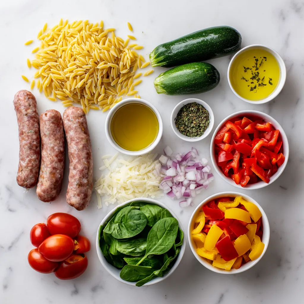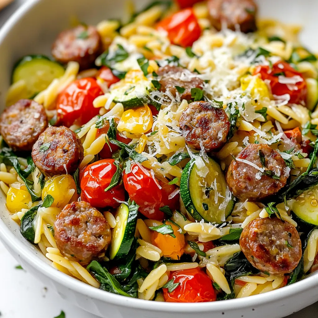 A flavorful dish featuring orzo pasta, Italian sausage, and fresh vegetables, perfect for a hearty meal.