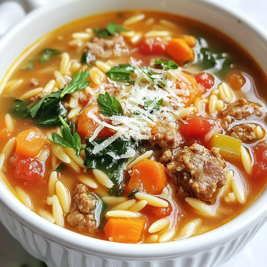 A hearty and flavorful soup made with Italian sausage, orzo pasta, and fresh vegetables.
