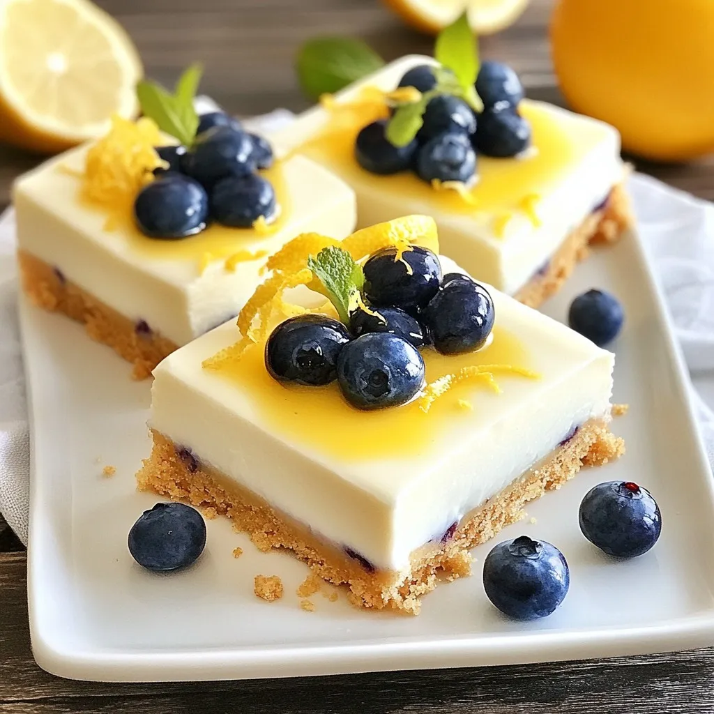 - 1 ½ cups graham cracker crumbs - ½ cup unsalted butter, melted - 2 tablespoons granulated sugar - 16 oz cream cheese, softened - ¾ cup granulated sugar - 2 large eggs - Zest of 1 lemon - ¼ cup fresh lemon juice - 1 teaspoon vanilla extract - 1 cup fresh blueberries (plus extra for garnish) - 1 tablespoon cornstarch Using fresh blueberries gives the best flavor and texture. The lemon juice adds a bright taste. Make sure your cream cheese is softened. This helps create a smooth filling. The graham cracker crumbs form a delicious crust. They add a nice crunch and sweetness. If you need a gluten-free option, use gluten-free graham crackers. For a dairy-free version, try a vegan cream cheese. You can also use maple syrup instead of sugar for a natural sweetener. Adjust the amount based on your taste preference. {{ingredient_image_1}} Start by preheating your oven to 350°F (175°C). Line an 8x8 inch baking dish with parchment paper. Make sure to leave some paper hanging over the sides. This will help you lift the bars out later. In a mixing bowl, combine 1 ½ cups of graham cracker crumbs, ½ cup of melted unsalted butter, and 2 tablespoons of sugar. Mix these until the crumbs are well coated. Once mixed, press this crumb mixture firmly into the bottom of your prepared dish. Bake the crust for 8-10 minutes until it is set and lightly golden. After baking, let it cool slightly. Next, take a large bowl and beat 16 oz of softened cream cheese with an electric mixer. Mix until it is smooth. Gradually add in ¾ cup of sugar, mixing until creamy. Then, add the 2 large eggs one at a time. Make sure each egg is mixed in well before adding the next. Now, mix in the zest of 1 lemon, ¼ cup of fresh lemon juice, and 1 teaspoon of vanilla extract until everything is blended. In a small bowl, toss 1 cup of fresh blueberries with 1 tablespoon of cornstarch. Gently fold these blueberries into the cheesecake filling. Take care not to burst the berries as you mix. Pour the cheesecake batter over your pre-baked crust. Spread it out evenly. Bake your bars in the oven for 25-30 minutes. The edges should be set, and the center should be slightly jiggly. It will firm up as it cools. Once baked, take the dish out of the oven and let it cool for about 30 minutes. Then, refrigerate the bars for at least 2 hours. This cooling time is key for the best texture. To serve, use the parchment paper to lift the cheesecake out of the dish. Cut into bars and garnish with extra blueberries if you like. Enjoy! To get the right texture, use room temperature cream cheese. It blends smoothly and avoids lumps. I beat it until it's creamy, about two minutes. Add the sugar slowly for a sweet mix. When you add the eggs, do it one by one. This way, each egg mixes well before the next one goes in. The lemon juice and zest give it a fresh taste, making the texture light and bright. Cracking can happen when the cheesecake cooks too fast. To avoid this, do not open the oven door while baking. Keep the oven's temperature steady at 350°F. If you bake it too long, the edges cook too much. Look for a slight jiggle in the center; it will firm up as it cools. Cooling slowly is key, so let it sit in the oven for a bit after baking. You need a few simple tools for this recipe. A mixing bowl for the crust and filling is a must. An electric mixer helps mix the cream cheese and sugar well. Use a 9x9 inch baking dish lined with parchment paper. This helps you lift the bars out easily later. Finally, a sharp knife will help you cut neat bars after chilling. Pro Tips Use Room Temperature Cream Cheese: For a smoother and creamier filling, ensure that your cream cheese is at room temperature before mixing. This helps to avoid lumps in your cheesecake batter. Don’t Overmix: Mix the batter just until combined, especially after adding the eggs. Overmixing can incorporate too much air, leading to cracks during baking. Chill Properly: Allow the cheesecake bars to cool for at least 2 hours in the refrigerator. This ensures they set properly and makes them easier to cut into neat bars. Garnish for Presentation: Add extra fresh blueberries on top before serving for a beautiful presentation and an extra burst of flavor. {{image_2}} You can swap blueberries for other fruits in this recipe. Raspberries, strawberries, or blackberries work well. Each fruit brings a new taste. For example, raspberries add a tart kick. Strawberries give a sweet and juicy flavor. You can also mix fruits to create a fun blend. Just keep the amount the same: one cup of fruit. You can change the flavor of your cheesecake bars easily. Add spices like cinnamon or nutmeg for warmth. You can also mix in some chocolate chips for a rich twist. If you love coconut, add some shredded coconut to the batter. Want a little zest? Try adding lime or orange juice instead of lemon. These flavors can brighten your bars even more. If you need a gluten-free option, you can use gluten-free graham crackers. They work just as well in the crust. You can also use almond flour or crushed nuts for a different base. Just mix them with melted butter and sugar, like the original recipe. This way, you can still enjoy delicious cheesecake bars without gluten. To keep your Lemon Blueberry Cheesecake Bars fresh, store them in the fridge. Use an airtight container to prevent them from drying out. If you plan to serve them later, do not cut the bars until you are ready. This helps maintain their shape and texture. You can freeze these cheesecake bars for longer storage. First, let them cool completely in the fridge. Then, wrap each bar tightly in plastic wrap. Place the wrapped bars in a freezer bag or container. They can last up to three months in the freezer. When ready to eat, thaw them in the fridge overnight. These delicious bars can last in the fridge for about five days. Make sure to keep them covered to avoid any odors from other foods. If they start to look or smell off, it's best to toss them. Enjoy your t