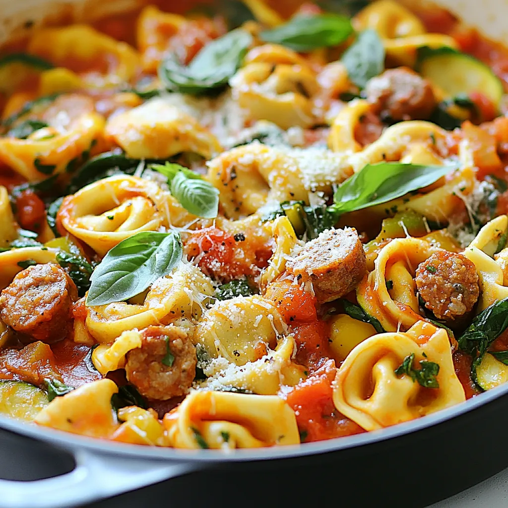 A delicious one-pan meal featuring cheese tortellini, savory sausage, and fresh vegetables.