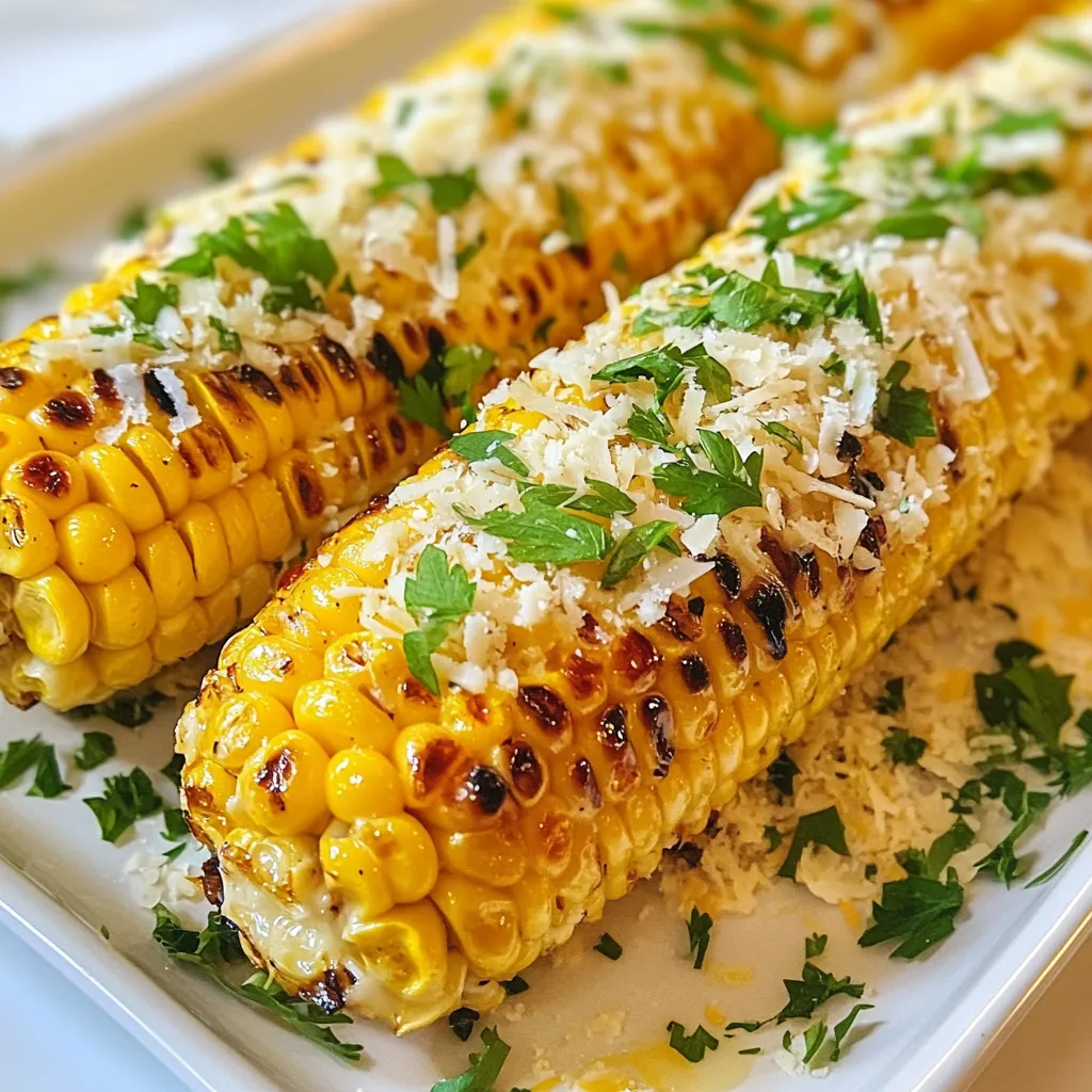 Grilled corn on the cob brushed with a flavorful butter mixture and topped with Parmesan cheese.