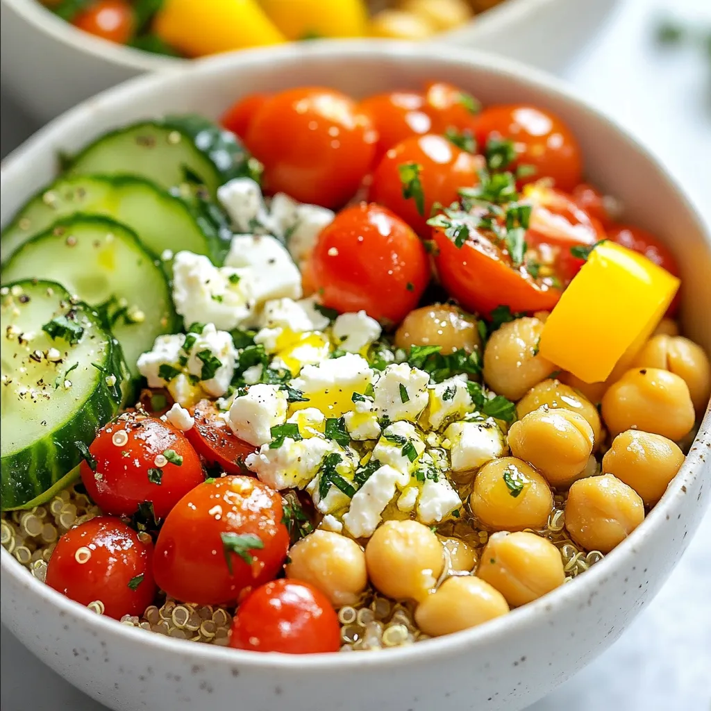A nutritious and vibrant quinoa bowl packed with fresh vegetables, chickpeas, and a zesty dressing.