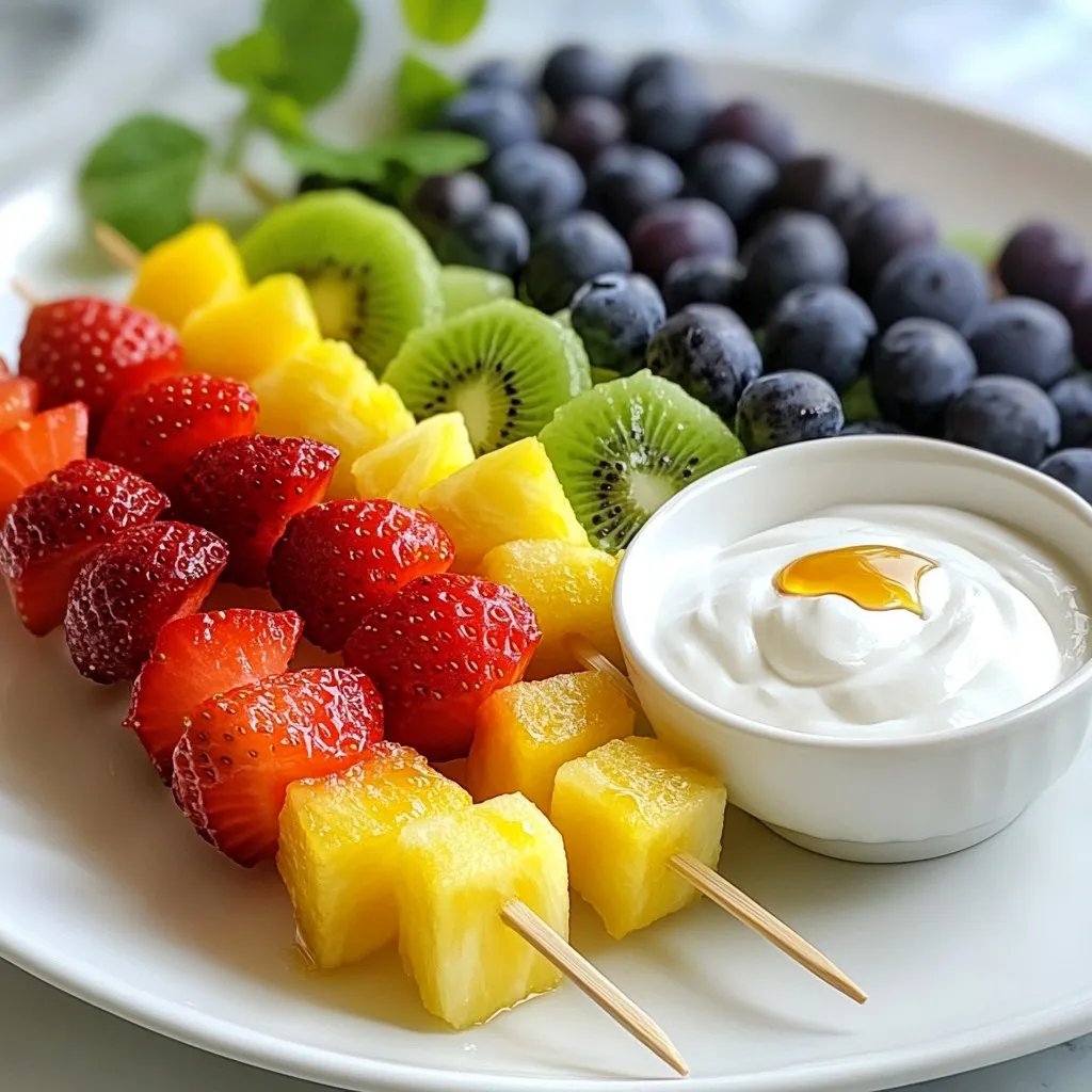For the Rainbow Fruit Kabobs, you need a mix of fruits that look vibrant and taste great. Here is what you'll need: - 1 cup strawberries, hulled and halved - 1 cup pineapple, cubed - 1 cup kiwi, peeled and sliced - 1 cup blueberries - 1 cup green grapes - 1 cup watermelon, cubed These fruits bring bright colors and flavors to your kabobs. You can mix and match based on what you like or have on hand. For the yogurt dip, gather these simple ingredients: - 1 cup plain Greek yogurt - 2 tablespoons honey - 1 teaspoon vanilla extract This dip adds a creamy touch to your kabobs. It balances the sweet fruit perfectly. You can also add optional garnishes to enhance your dish: - Fresh mint leaves for garnish (optional) These mint leaves not only add color but also a refreshing taste. They make your kabobs look even more appealing on the plate. {{ingredient_image_1}} Start by washing all your fruit. Rinse strawberries, grapes, and blueberries under cold water. For larger fruits like pineapple, kiwi, and watermelon, peel them carefully. Cut them into bite-sized pieces. Aim for similar sizes to help with even threading on skewers. - Strawberries: Hulled and halved. - Pineapple: Cut into 1-inch cubes. - Kiwi: Peeled and sliced into rounds. - Blueberries: Keep whole. - Green grapes: Leave them whole. - Watermelon: Cut into 1-inch cubes. To keep your fruit fresh, store it in the fridge. Use airtight containers to avoid browning. In a small bowl, whisk together the plain Greek yogurt, honey, and vanilla extract. Mix until smooth. This dip should be creamy but not too thick. Taste it to adjust sweetness. - For a thicker dip, add more yogurt. - For a sweeter dip, add more honey. Grab a skewer and start threading the fruit. Aim for a colorful pattern. A fun order might be strawberry, pineapple, kiwi, blueberry, grape, and watermelon. Fill each skewer with about 5-6 pieces of fruit. Make sure to press the fruit gently to keep it secure. Balance your skewer by alternating heavier and lighter fruits. This keeps the kabob from tipping. Once you finish, arrange the kabobs on a platter. Serve the yogurt dip in a small bowl on the side. Enjoy the vibrant colors and fresh flavors! - Arrange your kabobs in a rainbow pattern. This makes them fun to look at. - Use a large white platter for a clean and bright display. - Add some fresh mint leaves around the kabobs. This adds color and freshness. - For extra flair, try using colorful skewers. They can brighten up the dish. - To change the taste, add a splash of lemon juice. It gives a nice zing. - Try using maple syrup instead of honey. It adds a unique flavor. - You can mix in cinnamon or nutmeg for warmth. These spices can enhance the dip. - For a fruity twist, add a few mashed berries to your yogurt. It adds flavor and fun colors. Pro Tips Choose Ripe Fruits: Selecting ripe and seasonal fruits will enhance the flavor and sweetness of your kabobs. Soak Wooden Skewers: If using wooden skewers, soak them in water for at least 30 minutes to prevent burning on the grill. Mix Up the Patterns: Get creative with the arrangement of your fruits for a visually appealing presentation that excites the palate. Chill Before Serving: Refrigerate the kabobs for a short time before serving for a refreshing, cool treat, especially on warm days. {{image_2}} You can switch up the fruits based on what you like or what’s in season. Here are some tasty ideas: - Seasonal Fruits: Try peaches in summer or apples in fall. Cherries and figs are great in late spring. - Berries and Melons: Mix strawberries, raspberries, and blueberries for a berry burst. Add cantaloupe or honeydew for a refreshing melon twist. - Favorite Fruits: Use your go-to fruits. If you love mango, replace pineapple with it. If you enjoy bananas, cut them into slices and add them in. The yogurt dip is just the start. You can try many other dips: - Yogurt Dip Variations: Use flavored yogurts like strawberry or coconut for a fun twist. You can mix in spices or zest for more taste. - Other Dips: Hummus works well with fruit too. You can also try whipped cream or cream cheese for a sweeter option. - Nut Butter Options: Peanut butter or almond butter adds a nutty flavor. For a treat, dip the fruit in chocolate sauce instead. These variations make your Rainbow Fruit Kabobs fun and exciting for any gathering. To keep your rainbow fruit kabobs fresh, store them in a container with a lid. This helps prevent air from drying out the fruit. Place a damp paper towel in the container to maintain moisture. Refrigerate the kabobs right after serving. They last about 2 to 3 days in the fridge. The yogurt dip needs a separate container. It can also stay fresh for about 3 to 5 days. You can make kabobs in advance, but avoid adding the yogurt dip until serving. This keeps the fruit crisp and prevents sogginess. You can prepare the yogurt dip ahead of time. Just mix the Greek yogurt, honey, and vanilla extract, and store it in the fridge. For storage, use airtight containers. Glass or plastic containers both work well. This keeps everything fresh and ready for when you want to serve. Yes, you can use frozen fruit for kabobs. However, fresh fruit often tastes better. Frozen fruit can be watery and soft. If you choose to use frozen fruit, thaw it first. Pat it dry with a paper towel. This helps keep your kabobs from becoming soggy. You can also use frozen fruit for smoothies or desserts. Just remember, the taste and texture may differ from fresh fruit. Rainbow fruit kabobs stay fresh for about 24 hours in the fridge. After that, they may get mushy or lose flavor. Factors that affect freshness include the type of fruit and how you store them. Store kabobs in an airtight container to keep them fresh longer. If you notice any fruit getting brown or mushy, it’s best to eat it quickly. You can use many fruits for kabobs! Try bananas, peaches, or mangoes. Grapefruit and cherries also add fun flavors. When choosing fruit, think about the texture. Soft