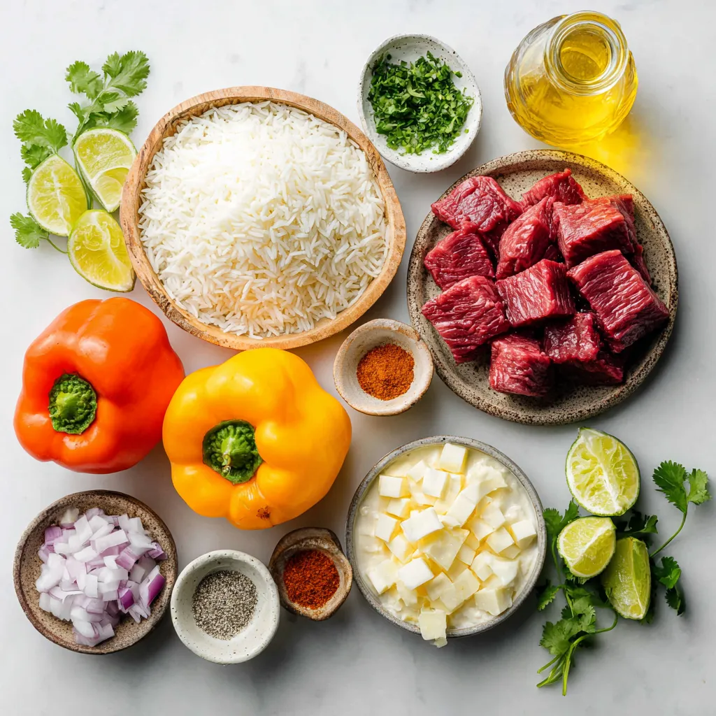 A flavorful one-pan dish featuring flank steak, jasmine rice, and creamy queso.