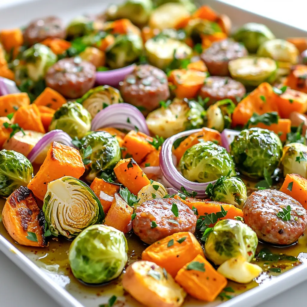 This dish shines with its simple yet flavorful ingredients. I love using Italian sausage for its rich taste. If you want a lighter meal, try chicken or turkey sausage. The mix of seasonal vegetables adds color and nutrition. Brussels sprouts bring a crunch, while sweet potatoes provide sweetness. Red onions and carrots round out the flavor profile.