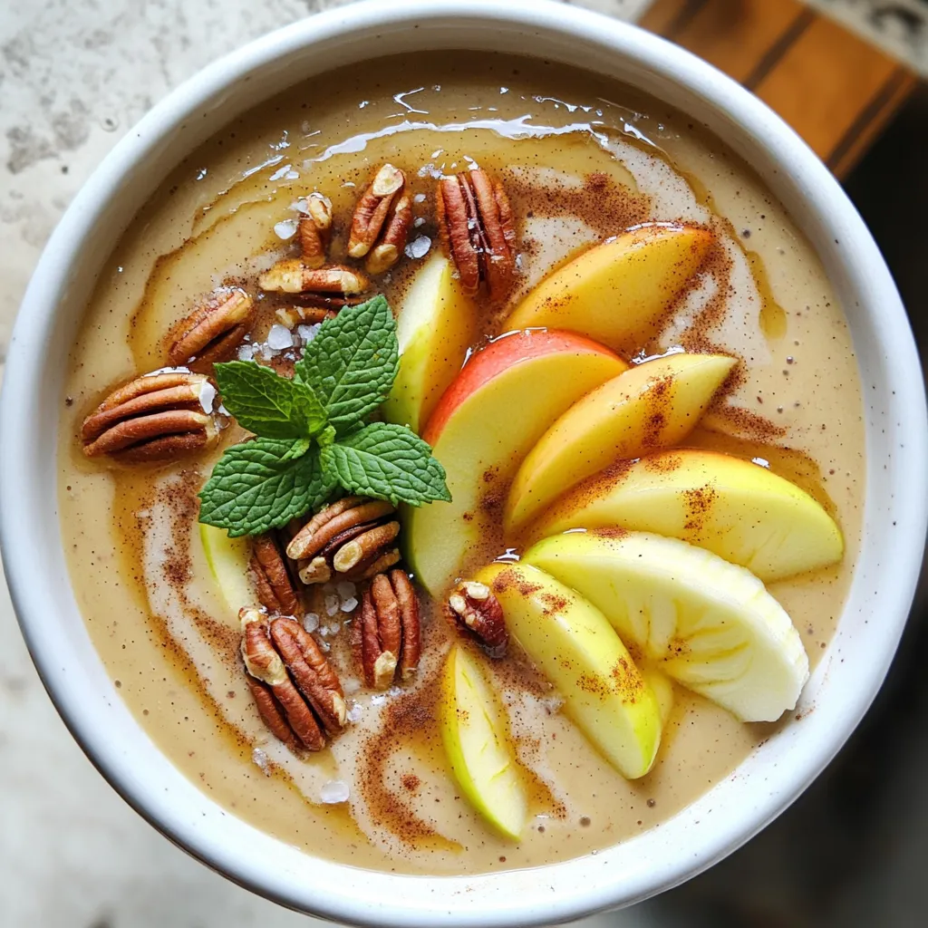 Now, pour the smoothie into a bowl. Carefully arrange 1/2 cup of sliced apples and 2 tablespoons of chopped pecans or walnuts on top. This adds crunch and flavor. Don’t forget to sprinkle a pinch of sea salt for an extra pop of taste. Finally, garnish with fresh mint leaves to make it look pretty and add a nice aroma. Enjoy your colorful and tasty spiced apple cider smoothie bowl!