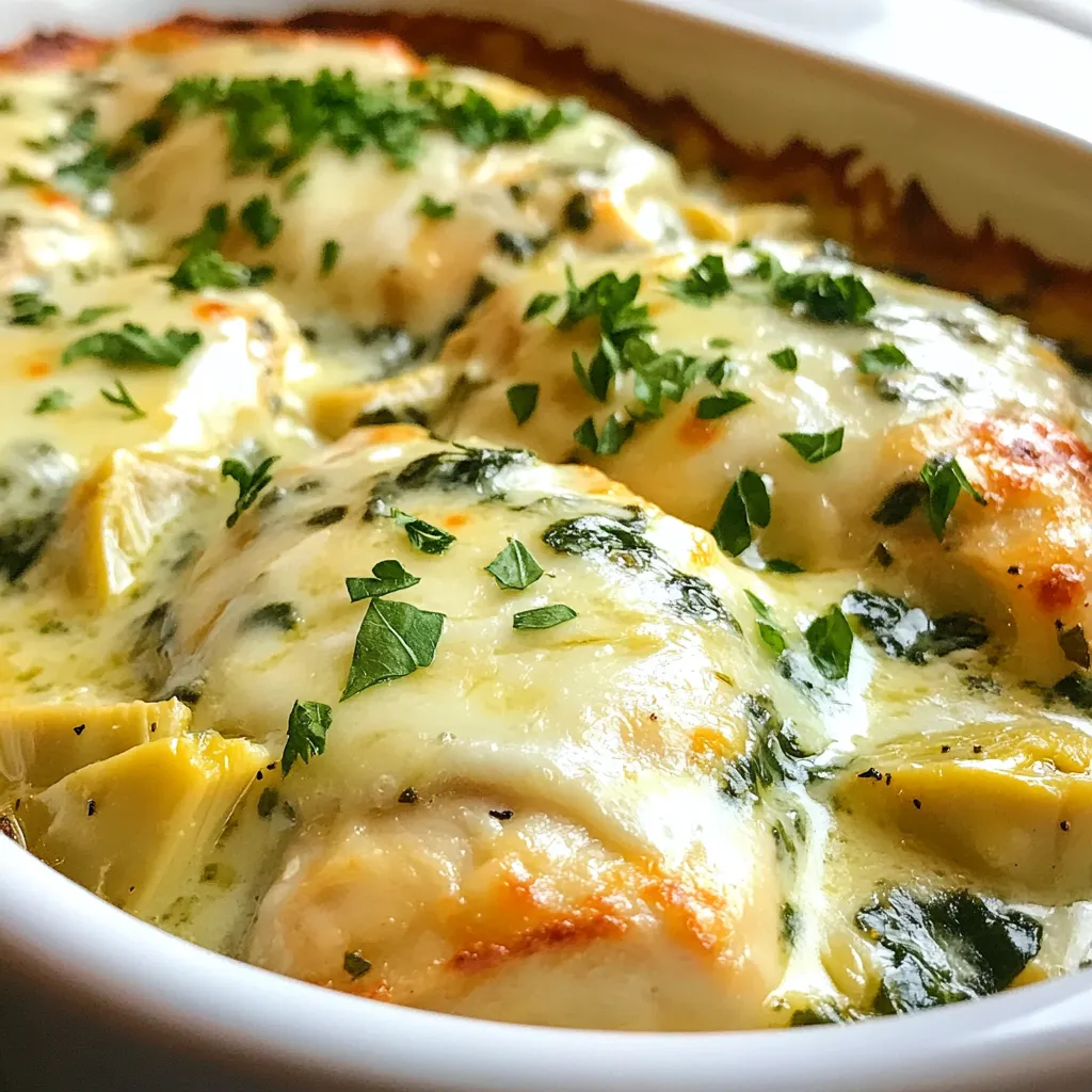 A delicious and creamy chicken bake featuring spinach and artichokes, perfect for a comforting meal.