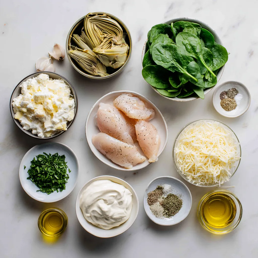 To make a delicious spinach artichoke chicken bake, gather these key items: