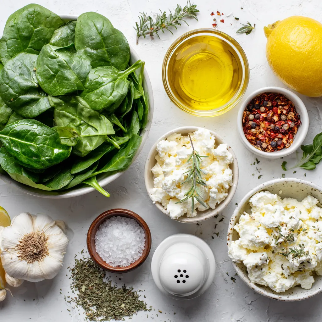 • In a medium bowl, mix together the chopped spinach, feta cheese, cream cheese, minced garlic, red pepper flakes (if using), oregano, lemon zest, and lemon juice. Season the mixture with salt and pepper to taste.