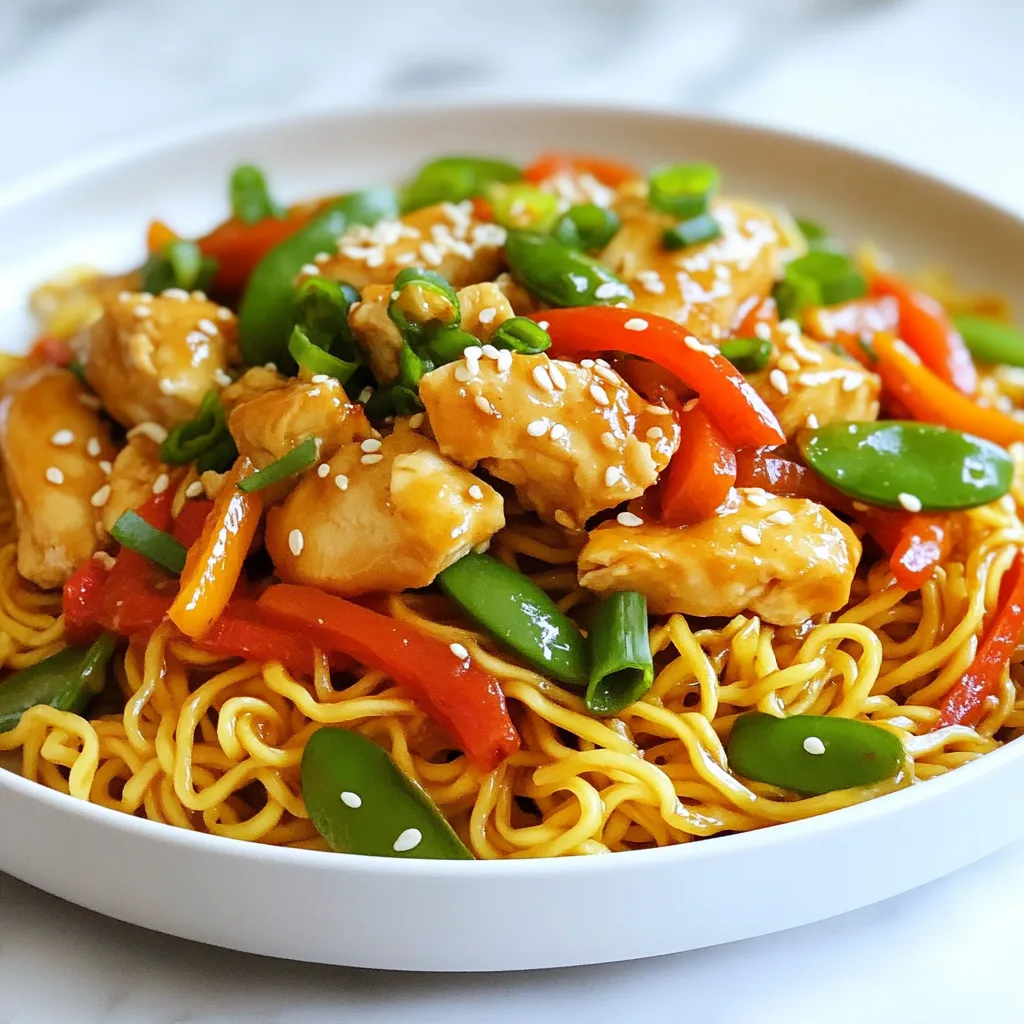 Plating can make your dish stand out. Use a large white plate to show off the colors. Pile the noodles high and layer the chicken and veggies on top. For garnishing, sprinkle chopped green onions and sesame seeds over the dish. This adds color and a touch of elegance. A few cilantro leaves can also make it pop!