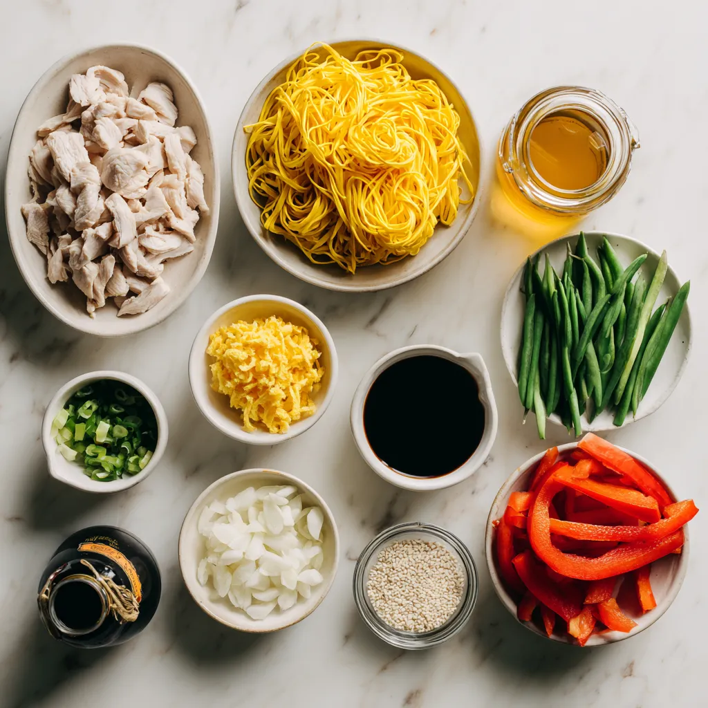 Gather these fresh ingredients for your Sticky Garlic Chicken Noodles. The chicken and noodles form the base of this dish. The garlic and ginger bring a lovely aroma. The sauces add depth and sweetness. The vegetables add color and crunch. Use the garnishes for a beautiful finish. Each part has a role in making this dish tasty and fun.