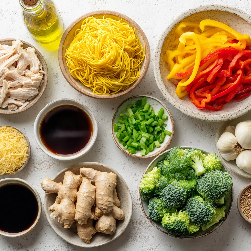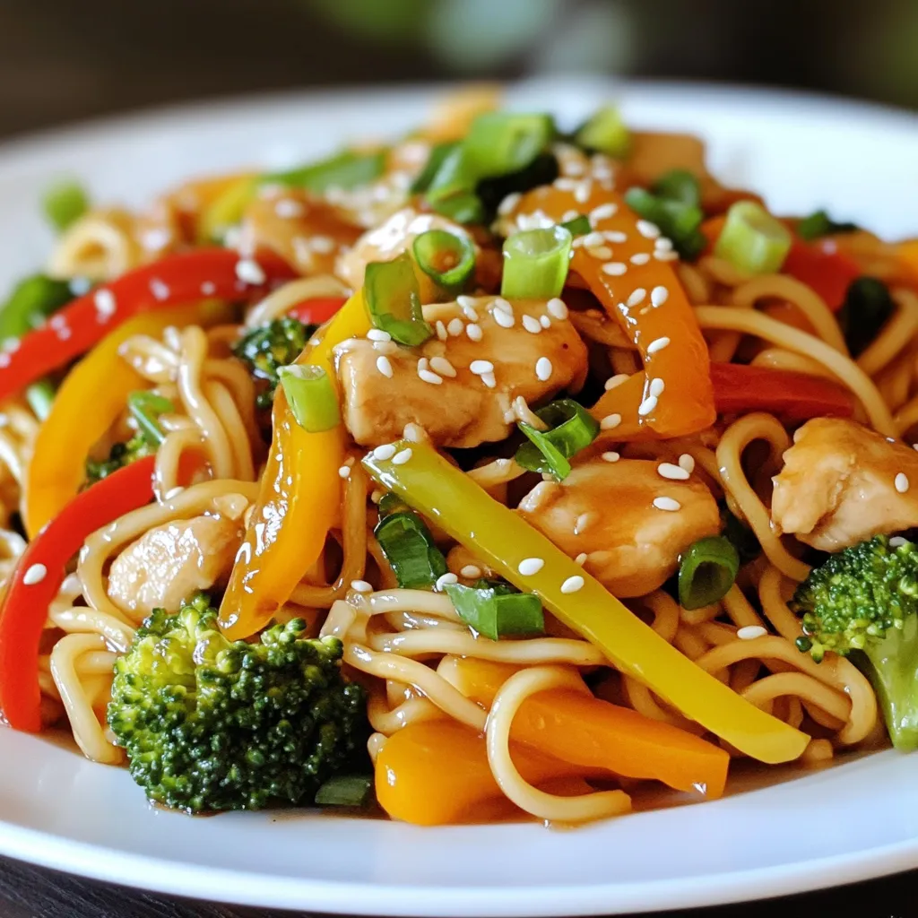 - 300g egg noodles - 2 chicken breasts, thinly sliced - 2 tablespoons vegetable oil - 1 cup mixed bell peppers, julienned - 1 cup broccoli florets - 3 green onions, chopped - 2 cloves garlic, minced - 1 tablespoon ginger, grated - 1/4 cup low-sodium soy sauce - 3 tablespoons honey - 1 tablespoon rice vinegar - 1 teaspoon sesame oil - Sesame seeds for garnish When I make Teriyaki Chicken Noodles, I love how fresh and bright the flavors are. Each ingredient plays a role. The egg noodles are soft and comforting. Thinly sliced chicken adds protein and a hearty feel. The vegetable oil helps everything cook well and stay juicy. I use mixed bell peppers for color and sweetness. Broccoli florets bring a nice crunch. Green onions add a mild onion flavor. Garlic and ginger boost the dish with warmth and depth. The sauce is what ties it all together. Low-sodium soy sauce gives a savory base. Honey adds a sweet touch, balancing the saltiness. Rice vinegar brings a hint of tang. Finally, sesame oil adds a nutty finish. Don't forget the sesame seeds! They add a lovely crunch and look great on top. Each ingredient makes this dish special and quick to prepare. You can find everything at your local store, making it easy to whip up this meal anytime. {{ingredient_image_1}} To cook the egg noodles, bring a pot of water to a boil. Add the noodles and cook them until soft, following the package instructions. Once done, drain the noodles and set them aside. This step is key to getting a tasty meal. In a large skillet or wok, heat the vegetable oil over medium-high heat. Add the sliced chicken to the skillet. Cook the chicken for about 5-7 minutes until it turns brown and is cooked through. This adds a nice flavor. Next, stir in the minced garlic and grated ginger. Cook these for another 1-2 minutes until they smell good. Now, it’s time to add the fun part. Toss in the mixed bell peppers and broccoli florets. Stir-fry them for about 4-5 minutes. You want them to be tender but still crisp. This keeps the dish fresh and bright. In a small bowl, mix together the soy sauce, honey, rice vinegar, and sesame oil. Pour this sauce over the chicken and vegetables in the skillet. Let it simmer for 2-3 minutes. This step helps all the flavors blend well together. Finally, add the cooked egg noodles to the skillet. Toss everything together until the noodles are coated in the sauce. Cook for an additional 2 minutes to make sure everything is heated through. For the finishing touch, stir in the chopped green onions. Remove the skillet from heat and sprinkle sesame seeds on top. Enjoy your tasty Teriyaki Chicken Noodles! - For perfect chicken, slice it thinly. This helps it cook evenly. - Cook the chicken until it is browned. This adds flavor and texture. - When adding vegetables, keep the heat high. This helps them stay crisp. - Stir-fry the bell peppers and broccoli quickly. Aim for 4-5 minutes of cooking. - Want more flavor? Try adding teriyaki sauce or sweet chili sauce. - If you like heat, add red pepper flakes. Start with a pinch and adjust to taste. - Garnish with sesame seeds for a nice finish. They add crunch and look great. - For plating, use a wide bowl. This showcases the colorful noodles and veggies. Pro Tips Use Fresh Ingredients: Fresh vegetables and chicken will enhance the flavor and texture of your dish significantly. Customize Your Vegetables: Feel free to add your favorite vegetables like snap peas or carrots for added crunch and color. Perfect Your Sauce: Adjust the balance of soy sauce and honey to your taste; more honey for sweetness or more soy for saltiness. Don’t Overcook the Noodles: Make sure to cook the noodles just until al dente, as they will continue to cook in the skillet. {{image_2}} For a vegetarian twist on teriyaki chicken noodles, you can swap the chicken. Use firm tofu or tempeh instead. Both options provide a similar texture and absorb flavors well. Add more veggies to make this dish exciting. Consider using: - Carrots, sliced thin - Snap peas for crunch - Mushrooms for umami flavor Mix these with the bell peppers and broccoli. Stir-fry them until they’re tender but still crisp. If you need a gluten-free meal, choose gluten-free noodles. Rice noodles or quinoa noodles work great. They cook quickly and take on flavors nicely. Adjust the sauce too. Use tamari instead of soy sauce. It has a similar taste but is gluten-free. Check your honey for gluten-free labeling if needed. You can enhance the dish by adding shrimp or tofu for extra protein. If you use shrimp, cook them for about 3-4 minutes until they turn pink. For tofu, cube it and pan-fry until golden, about 5-7 minutes. Adjust cooking times to ensure everything is cooked through. Enjoy your delicious teriyaki chicken noodles with these variations! Store any leftover Teriyaki Chicken Noodles in an airtight container. Make sure it cools to room temperature first. Keep it in the fridge. It will last about 3 to 4 days. Yes, you can freeze Teriyaki Chicken Noodles. Use a freezer-safe container. Divide it into portions for easy thawing. Make sure to leave some space for the noodles to expand. For reheating, the best method is to use a skillet. Add a splash of water to help steam the noodles. Heat over medium-low. Stir gently to avoid mushy noodles. You can also use a microwave. Heat in short bursts, stirring in between. This helps keep the noodles firm. It takes about 25 minutes to make this dish. You’ll spend 10 minutes prepping the ingredients. The cooking time is around 15 minutes. This quick meal fits perfectly into a busy day. Yes, you can use other noodles. Rice noodles or udon noodles work well. You can also try soba noodles for a nutty flavor. Just remember to adjust the cooking time based on the noodle type. This dish is not spicy. The flavors come from soy sauce, honey, and ginger. If you want some heat, add red pepper flakes or sriracha. Adjust the amount to fit your taste. Yes, you can make this dish ahead. Cook it and
