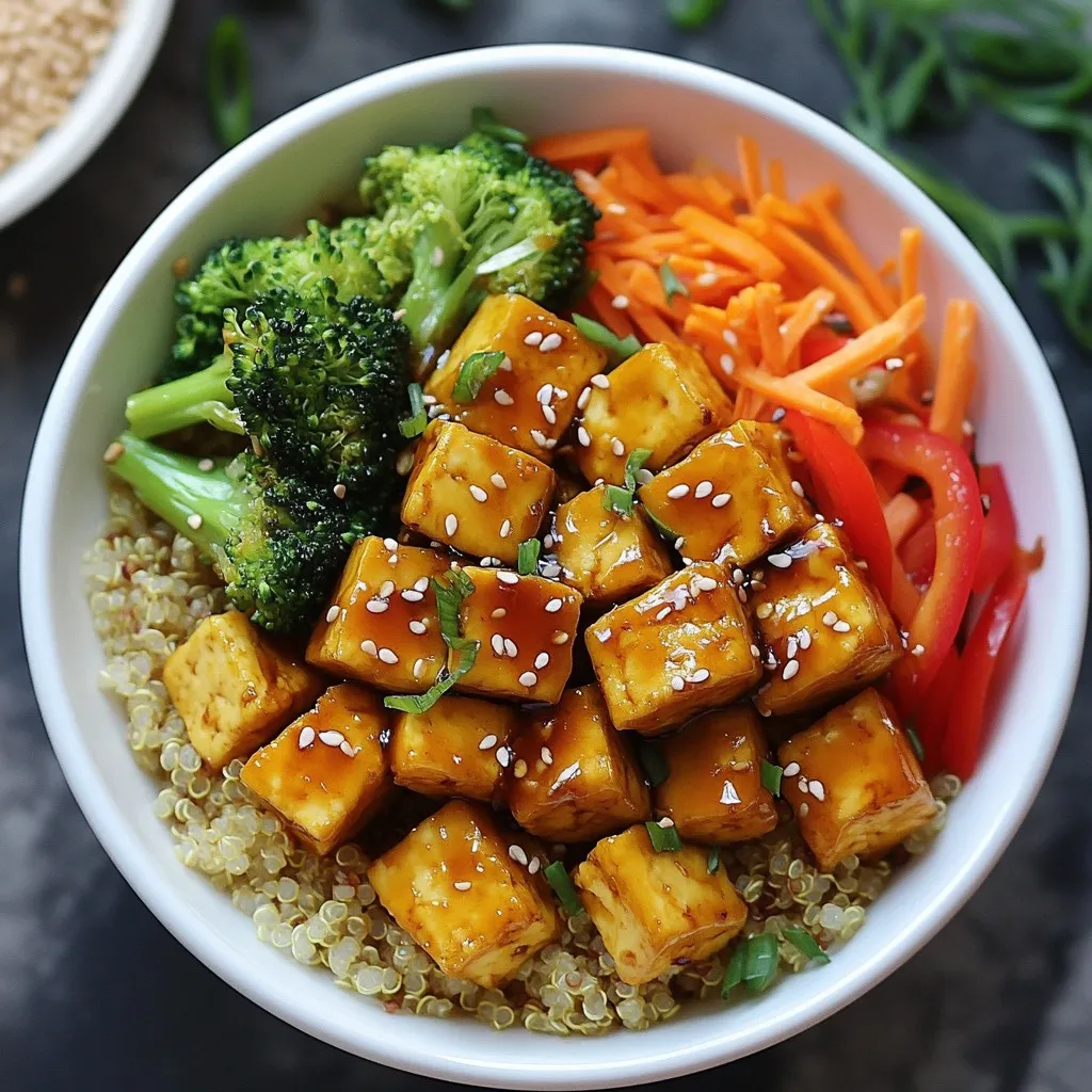 A nutritious and flavorful bowl featuring marinated tofu, quinoa, and vibrant vegetables.