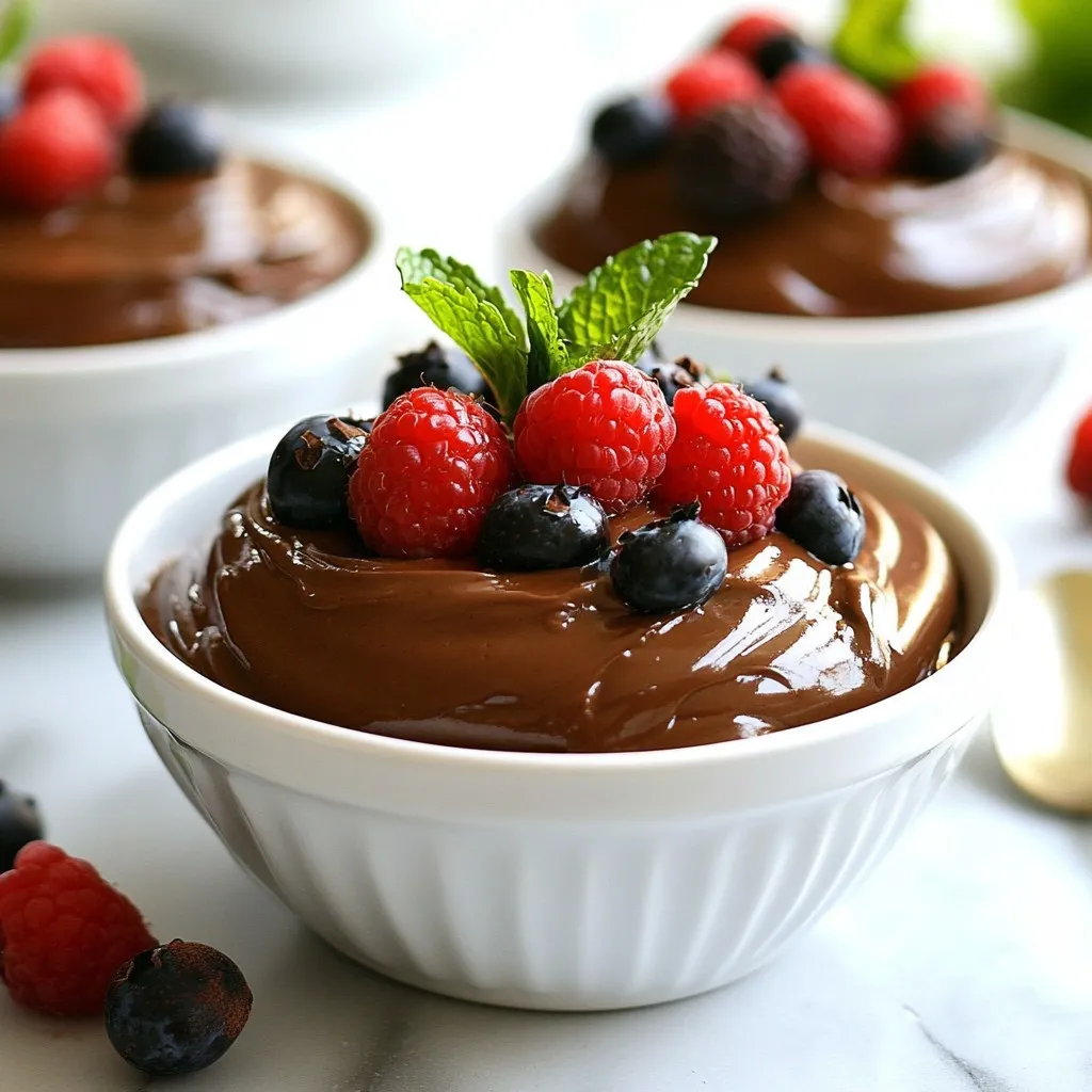 Once blended, transfer the mousse into small bowls or glasses. Cover them and place them in the fridge. Chill for at least 30 minutes. This helps the mousse firm up and enhances the flavors. When you are ready to serve, add fresh berries on top. A sprig of mint adds color and freshness to your dessert. Enjoy your tasty vegan treat!