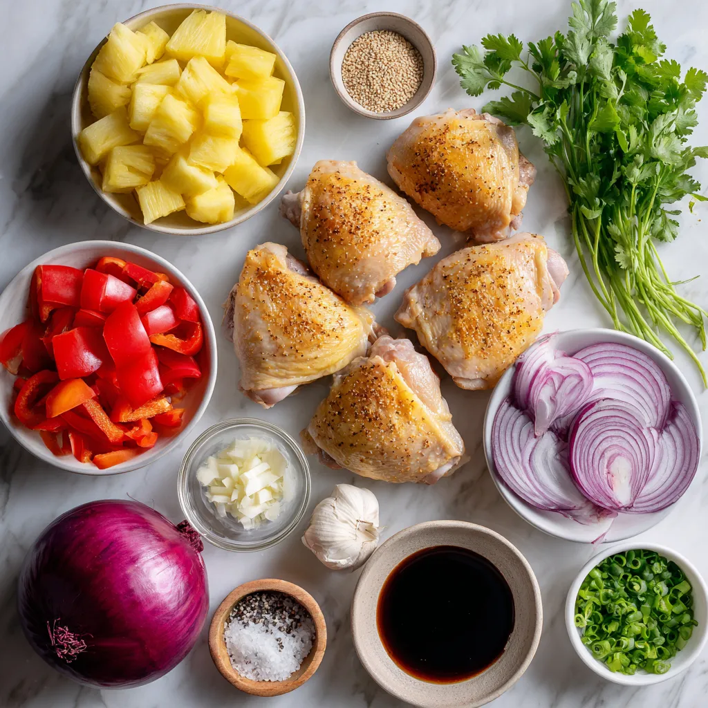 The main ingredients bring flavor and color to the dish. The chicken thighs ensure juiciness, while the fresh pineapple adds sweetness. Bell peppers and red onion give a nice crunch and brightness.