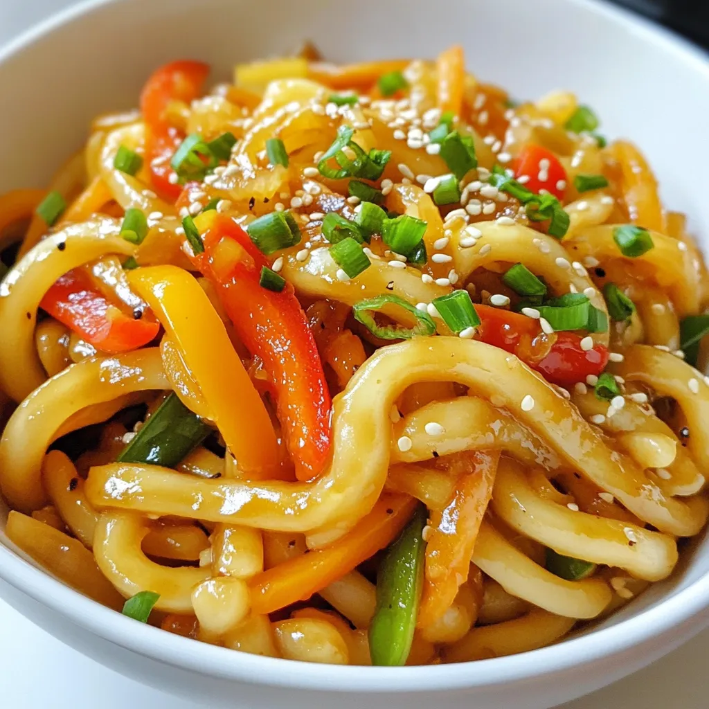 One common mistake is overcooking the udon noodles. This can make them mushy. Always rinse them in cold water after boiling. Another mistake is not using enough oil in the pan. This helps prevent sticking and gives a nice finish. Don’t skip the ginger or garlic; they add a lot of flavor. Finally, avoid cooking the noodles and veggies together for too long. You want them to keep their vibrant colors and crunch.