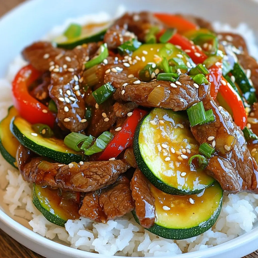 - 1 pound sirloin beef, thinly sliced - 2 medium zucchinis, sliced into half-moons - 1 red bell pepper, sliced - 1 cup snap peas, trimmed - 3 cloves garlic, minced - 1 tablespoon fresh ginger, grated - 3 tablespoons soy sauce (low sodium) - 1 tablespoon oyster sauce - 1 tablespoon hoisin sauce - 2 tablespoons vegetable oil - 1 teaspoon sesame oil - Cooked rice or quinoa for serving - Sliced green onions and sesame seeds for garnish When I prepare zucchini beef stir fry, I focus on fresh, quality ingredients. The sirloin beef is the star, bringing juicy flavor and a satisfying texture. I slice it thinly for quick cooking and easy bites. Zucchini adds a mild taste and nice crunch. I prefer medium zucchinis for the best balance. Adding red bell pepper gives a pop of color and sweetness. Snap peas bring a delightful crispness, making every bite exciting. I always include garlic and ginger. They add a punch and warmth, enhancing the overall flavor. For sauces, I reach for low sodium soy sauce. It keeps the dish savory without being too salty. Oyster sauce adds a rich depth, while hoisin sauce brings a hint of sweetness. I use vegetable oil for frying, and a touch of sesame oil at the end boosts the aroma. I often serve this dish over cooked rice or quinoa. It makes for a hearty meal. For an extra touch, I sprinkle sliced green onions and sesame seeds on top. These add color and a bit of crunch. Using fresh, vibrant ingredients makes this stir fry not just tasty but also visually appealing. Enjoy the flavors and textures that come together in this quick meal! {{ingredient_image_1}} To start, place the thinly sliced sirloin beef in a bowl. Add 1 tablespoon of soy sauce, 1 tablespoon of oyster sauce, and 1 tablespoon of hoisin sauce. Mix it well so the beef is coated. Let the beef marinate for at least 10 minutes while you get the vegetables ready. Next, heat 1 tablespoon of vegetable oil in a large skillet over medium-high heat. When the oil is hot, add the beef in a single layer. Cook it for about 2-3 minutes until it turns brown. Flip the beef over and cook for another 2 minutes. Once cooked, take the beef out of the skillet and set it aside. Now, use the same skillet and add 1 tablespoon of vegetable oil. Add 3 cloves of minced garlic and 1 tablespoon of grated ginger. Sauté this mix for about 30 seconds until it smells great. Then, add 2 medium zucchinis, 1 sliced red bell pepper, and 1 cup of snap peas. Stir-fry the vegetables for about 5-6 minutes until they are tender-crisp. Finally, return the cooked beef to the skillet with the veggies. Pour in the remaining soy sauce and 1 teaspoon of sesame oil. Stir everything together to mix well. Cook for an additional 2 minutes until everything is heated through. For stir-frying, sirloin beef works great. It is tender and cooks quickly. You can also use flank steak or ribeye for added flavor. When slicing beef, aim for thin strips. This helps it cook evenly. Freeze the beef for 30 minutes before slicing. This makes cutting it thin much easier. To boost flavor, try adding more spices. Red pepper flakes can add heat. A dash of black pepper or garlic powder works well too. You can also use sesame seeds for a nutty taste. Remember to taste as you go. Adjust the seasoning to your liking. Too much soy sauce can make it salty. High heat is key for a great stir-fry. It helps to sear the meat and keep the veggies crisp. Use a large skillet or wok to give everything space. Avoid overcrowding the pan. This can lead to steaming instead of frying. Stir-fry each ingredient separately if needed. Cook the veggies until they are tender-crisp. This keeps them bright and flavorful. Pro Tips Marinate for Flavor: Allow the beef to marinate for at least 10 minutes to absorb the flavors of the sauces, enhancing the overall taste of the dish. High Heat for Stir Fry: Ensure your skillet or wok is hot before adding the beef. This helps to sear the meat quickly, keeping it tender and juicy. Vegetable Crunch: To ensure the vegetables remain crisp, avoid overcooking them. Stir-fry just until they are tender-crisp, about 5-6 minutes. Garnish for Appeal: Don't skip the garnish! Sliced green onions and sesame seeds not only add color but also enhance the flavor and presentation of your dish. {{image_2}} You can swap the beef for chicken, shrimp, or tofu. Each protein offers a unique taste. If you use chicken, cut it into thin strips like the beef. This ensures even cooking. Shrimp cooks quickly, so only stir-fry it for 2-3 minutes. Tofu adds a nice texture. Press it to remove excess water before cooking. Adjust cooking times based on the protein you choose. This way, you’ll get a tender meal every time. Feel free to mix in other veggies for added flavor. Carrots, broccoli, or bell peppers work well. You can also try seasonal veggies like asparagus or snap peas. These add crunch and color. When choosing veggies, use what you have on hand. This keeps your meals fresh and fun. Using a variety of vegetables makes the dish more nutritious and colorful. You can make your own stir fry sauce at home. Mix soy sauce, ginger, and a splash of vinegar. This creates a tasty base. For a dietary-friendly option, use tamari for gluten-free sauce. You can also try low-sodium soy sauce or coconut aminos. These options keep the flavor while meeting your diet needs. Don’t hesitate to customize your sauce to match your taste. To keep your Zucchini Beef Stir Fry fresh, follow these steps: - Cool down: Let the stir fry cool to room temperature. - Use airtight containers: Store leftovers in airtight containers. - Refrigerate promptly: Place the containers in the fridge within two hours. This helps prevent bacteria growth and keeps the flavors intact. When reheating, aim to keep the texture and flavor. Here’s how: - Stovetop method: Heat a skillet over medium heat. Add a splash of water or oil, then stir in the stir fry. This keeps it moist. - Microwave method: Place in a microwave-safe dish. Cov